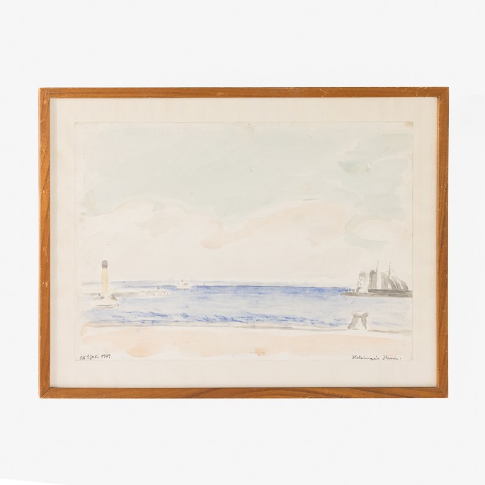 Watercolour in pastel colours in a wooden frame. Motif of Elsinore Harbour from July 1949. Signed.