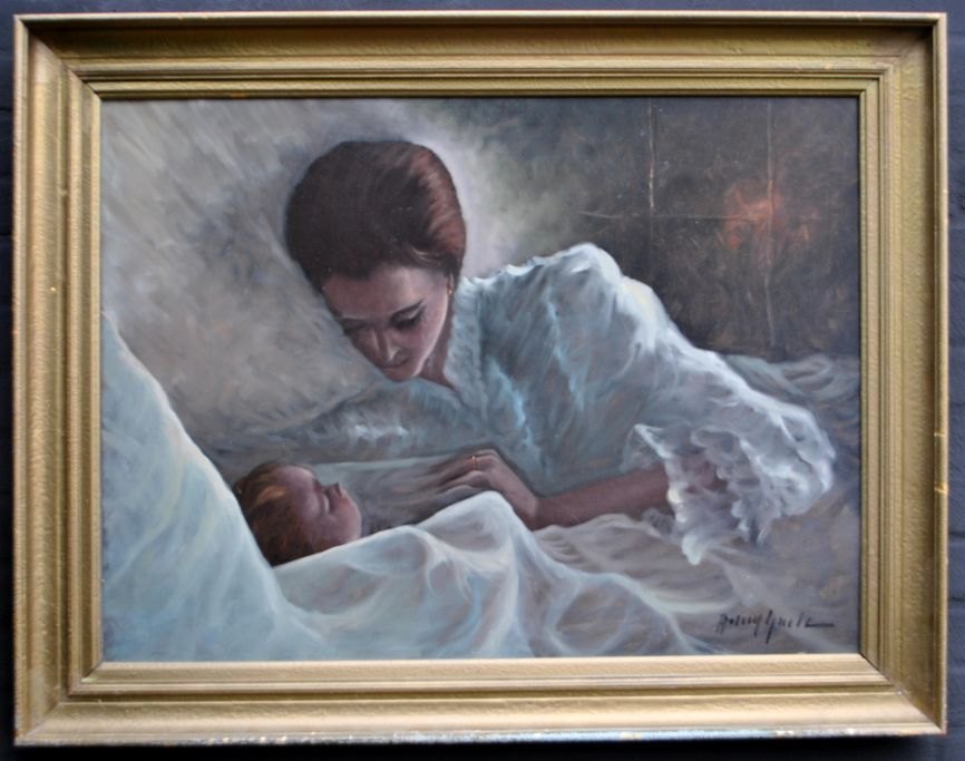 Gade, Arling (1919 - 2011) Danmark. Mor med barn. Olie på masonit. Signeret. 64,5 x 85 cm.