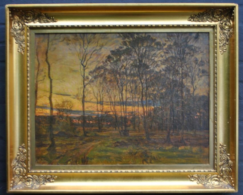 Jensen-Klint, Peder Vilhelm (1853 - 1930) Danmark: Solnedgang. Olie på lærred. Signeret. 46 x 62 cm. Billedet er også betegnet verso på blændrammen.  Indrammet i en hjørneornamenteret ramme: 61 x 76 cm.