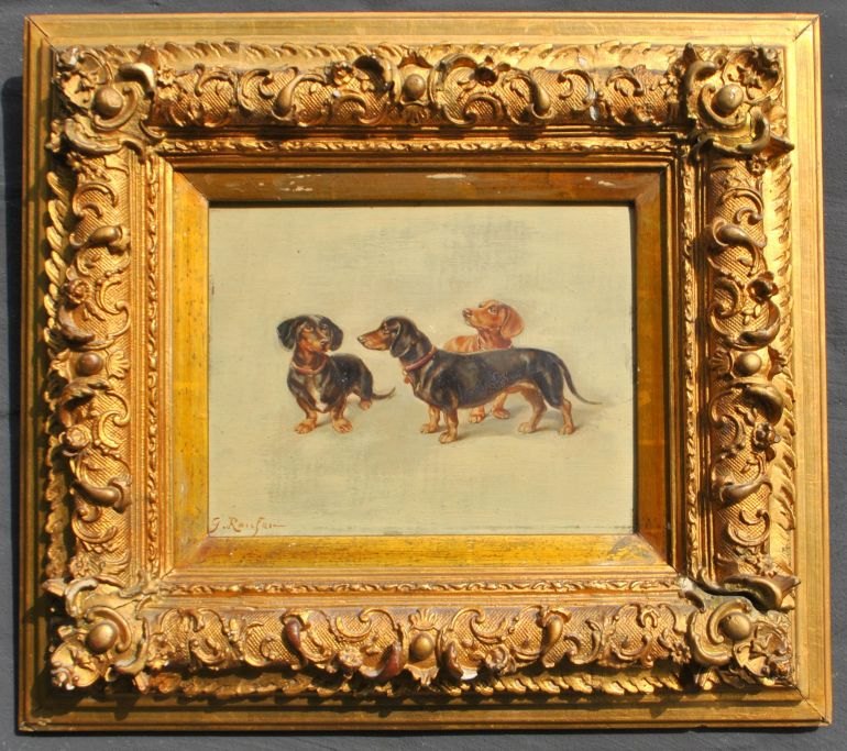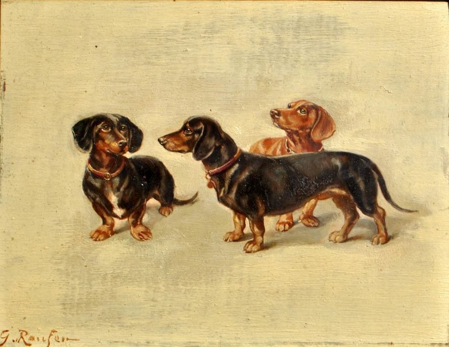 Raufer, G. (19. årh.) Tre gravhunde. Olie på træplade. Signeret. 21 x 28 cm.