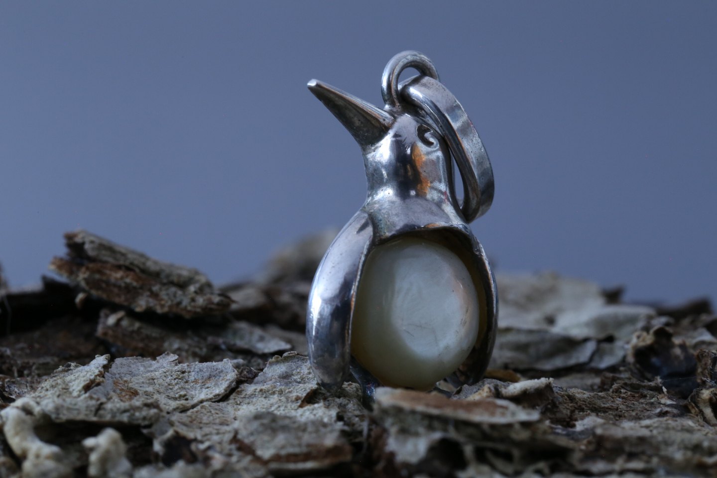 Vedhæng i sølv, formet som pingvin, og med en månesten. Stemplet 925S
