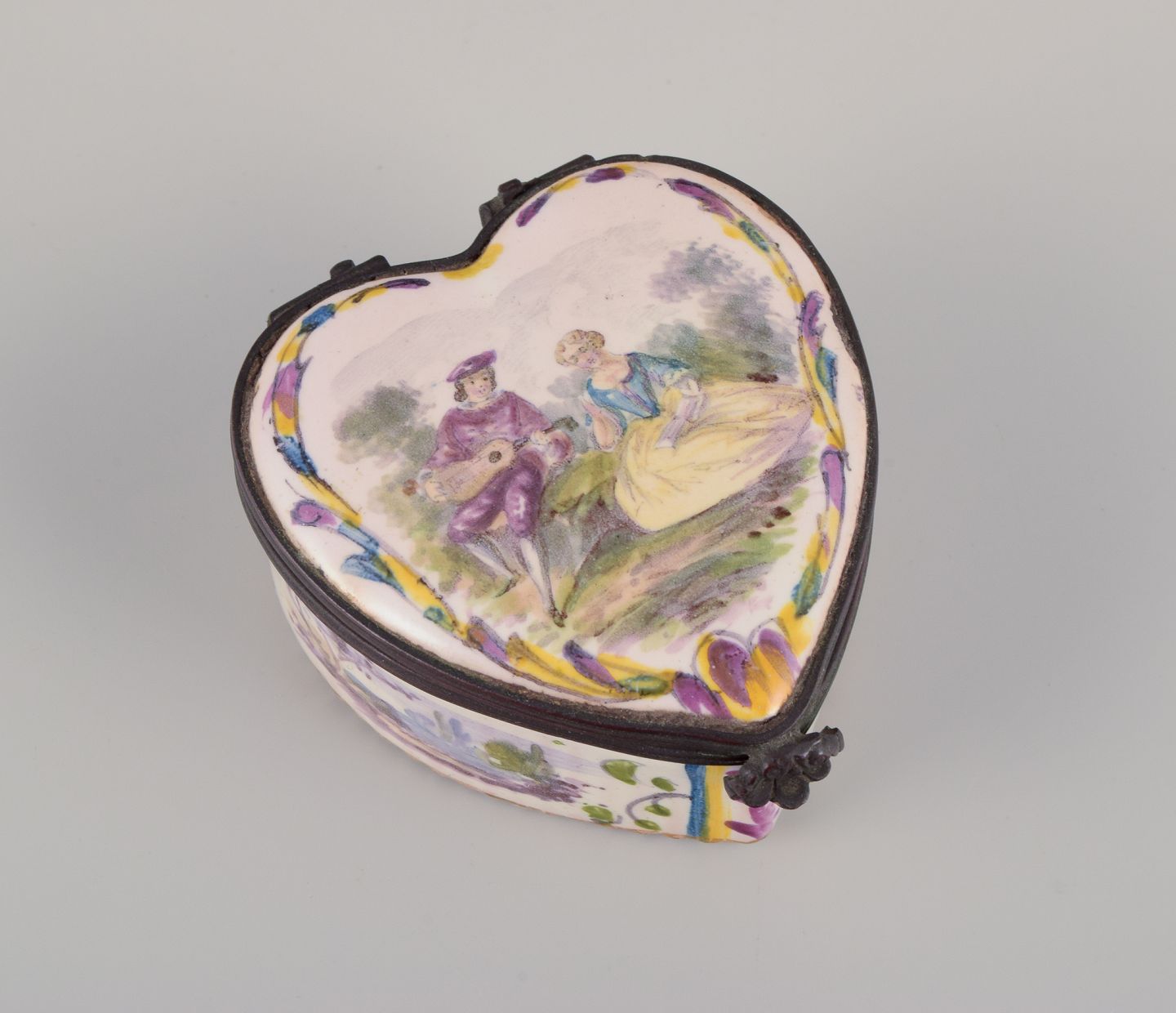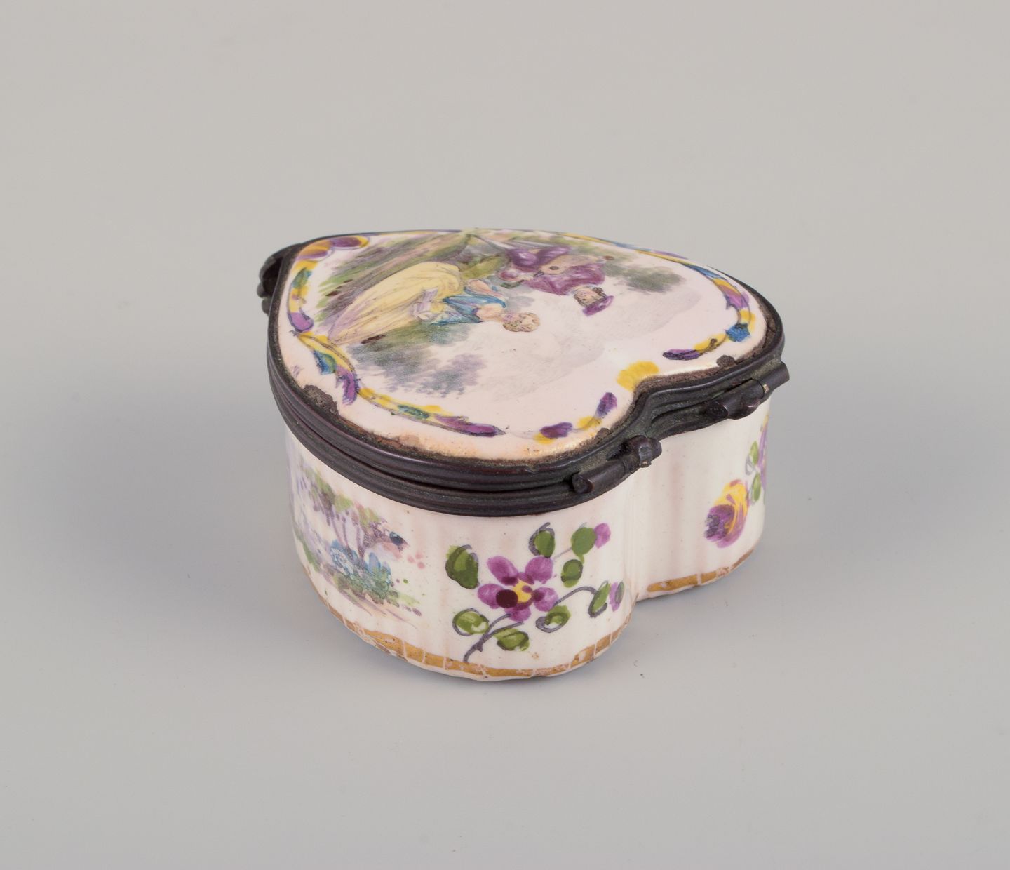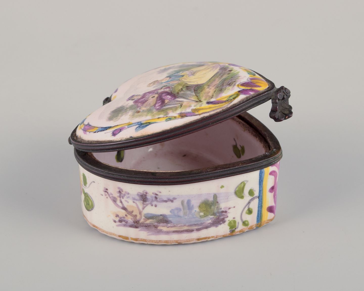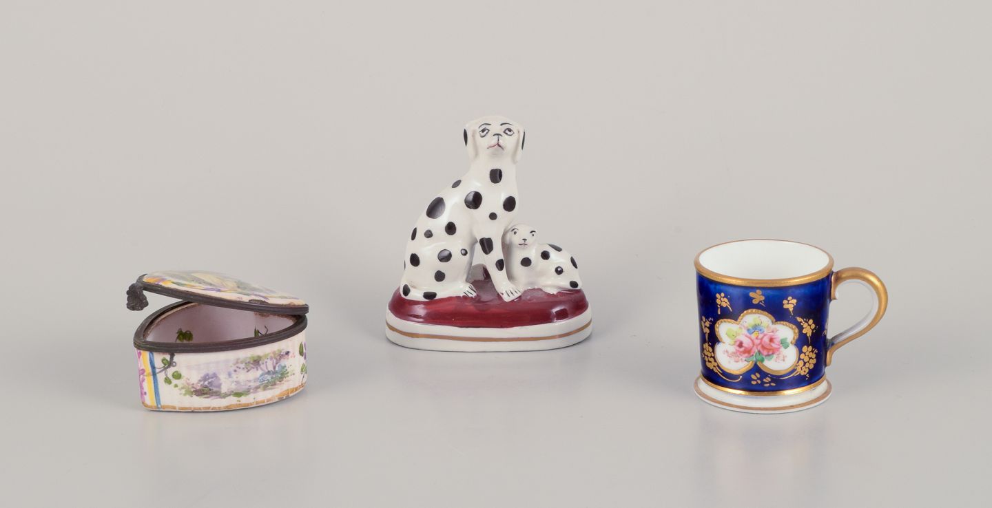 Tre dele fransk og engelsk porcelæn bestående af Royal Crown Derby miniaturekrus, miniature porcelænsfigur af to dalmatinere samt en hjerteformet JACQUES FEBVRIER Manufactory lågæske i fajance signeret, Lille 1763.