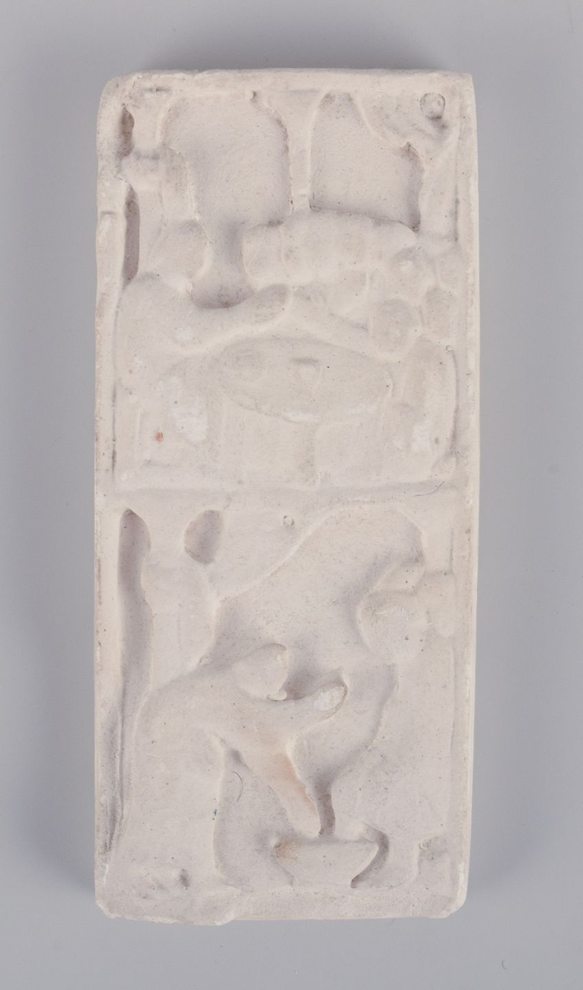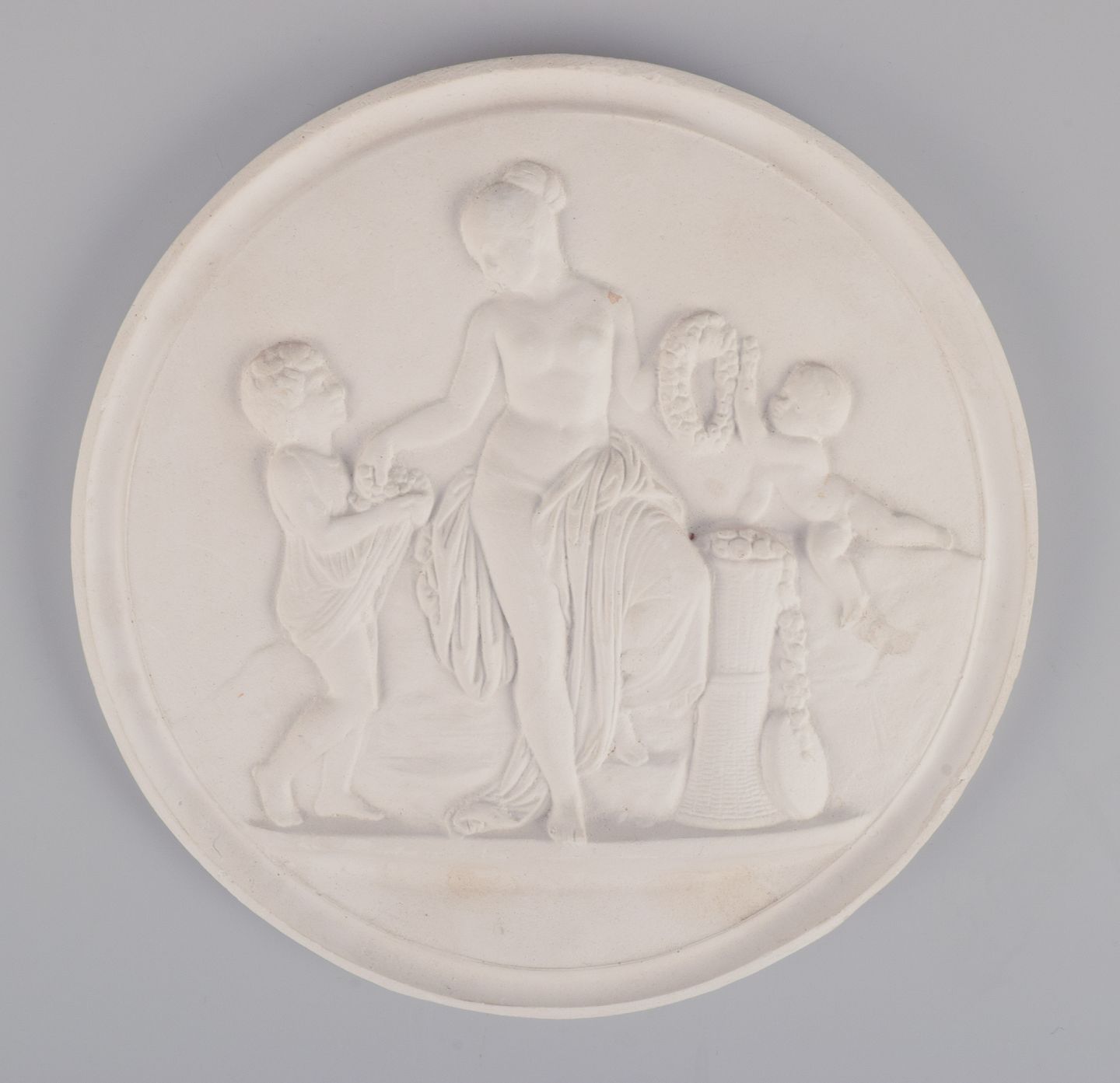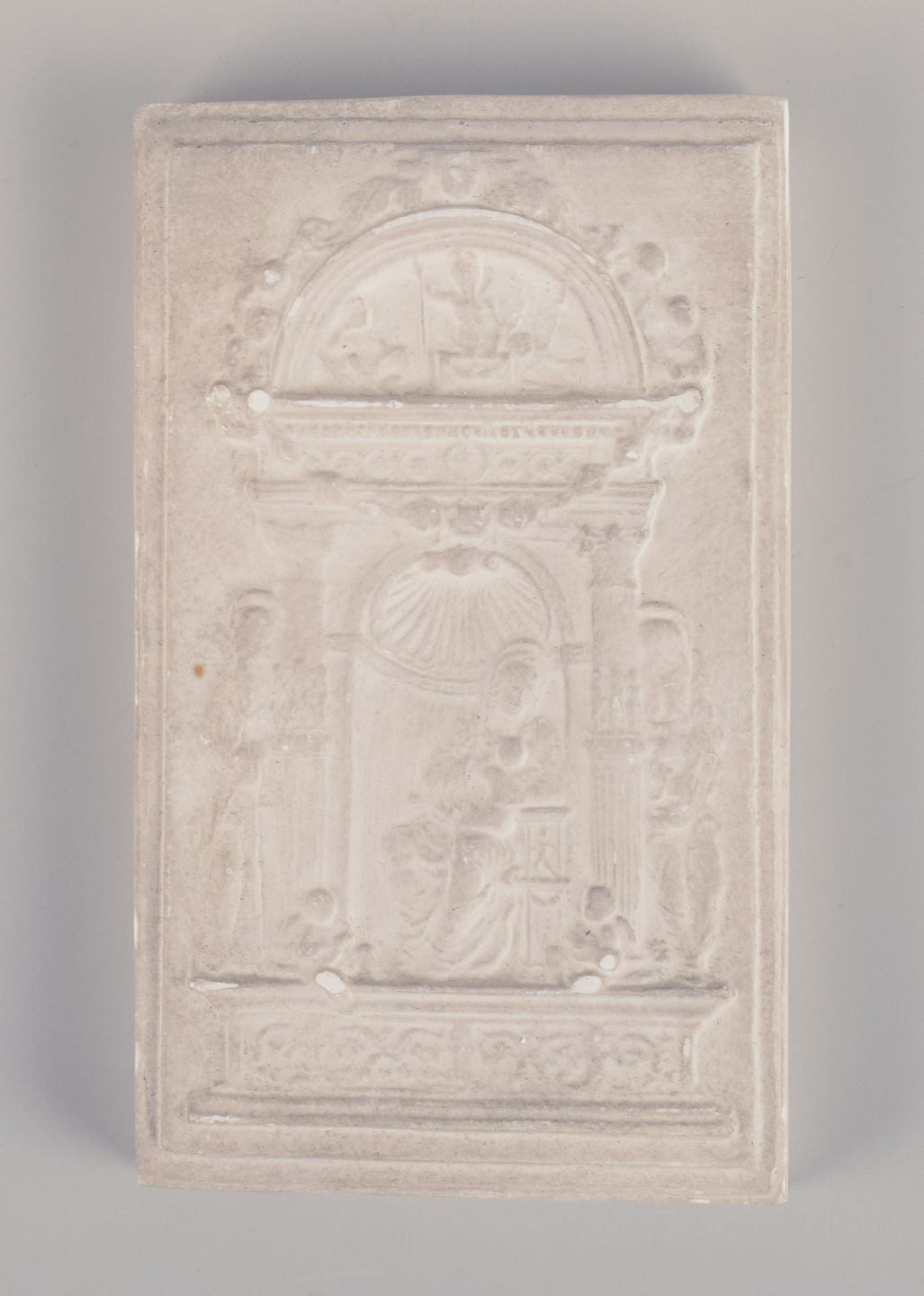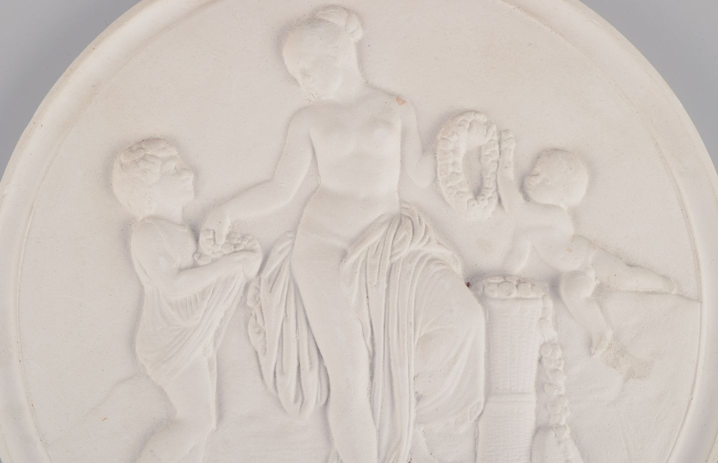 Fire relieffer i gips. Stor rund plakette med Bertel Thorvaldsen motiv, religiøst motiv samt kvinde i profil.