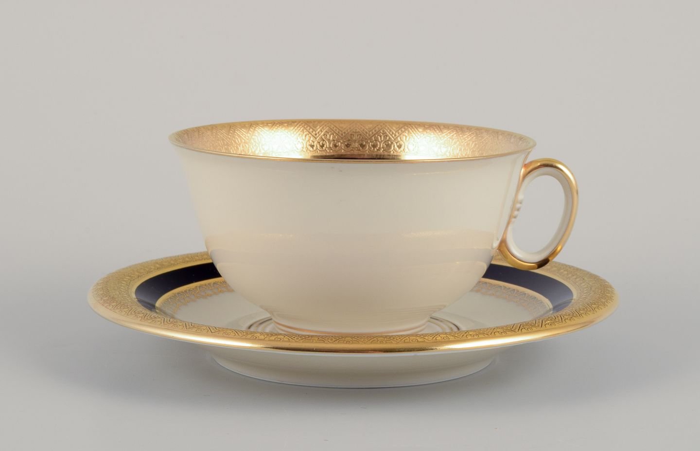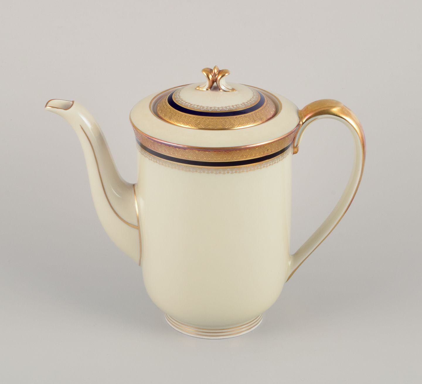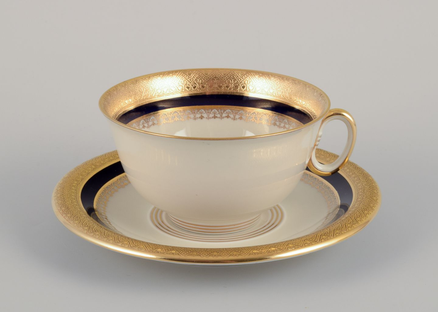 Hutschenreuther, Tyskland. Komplet sekspersoners kaffeservice, bestående af seks store kaffekopper med underkopper, sukkerskål og kaffekande. Fra serien ”Margarete”. Hånddekoreret guld og kongeblå.