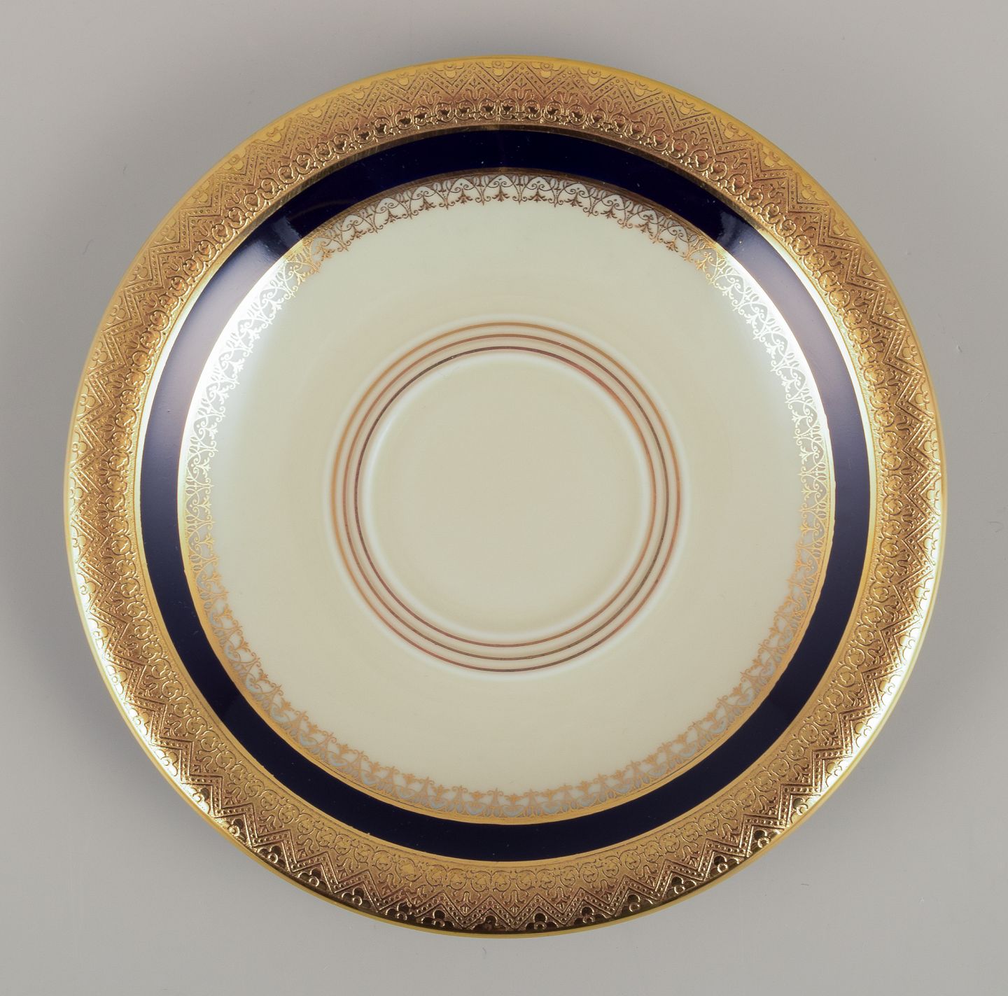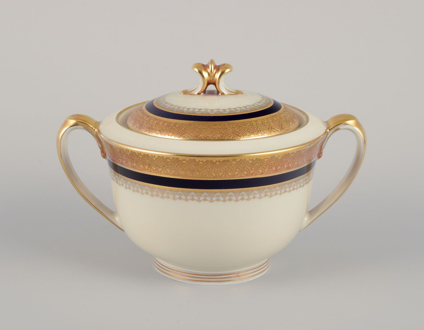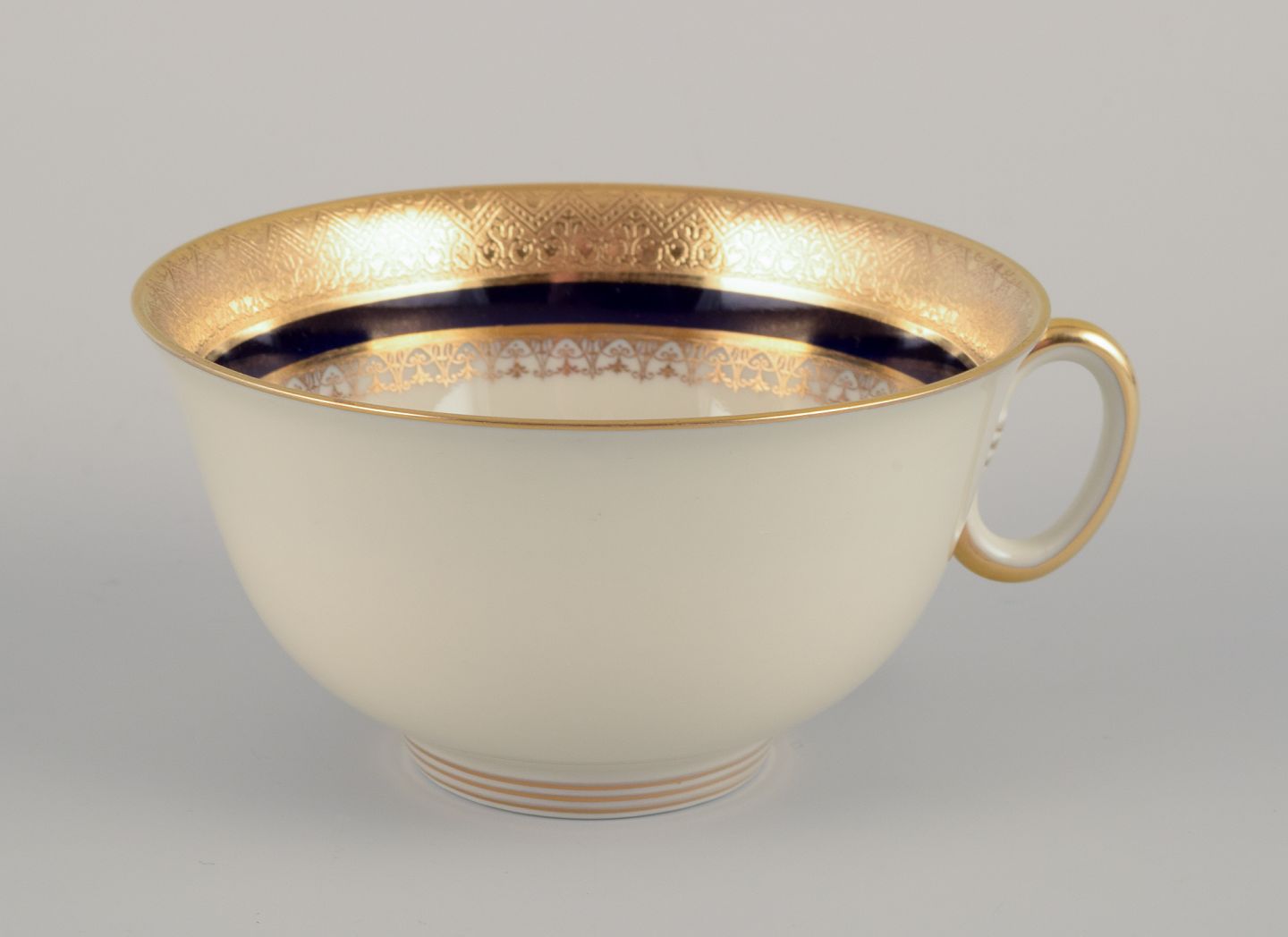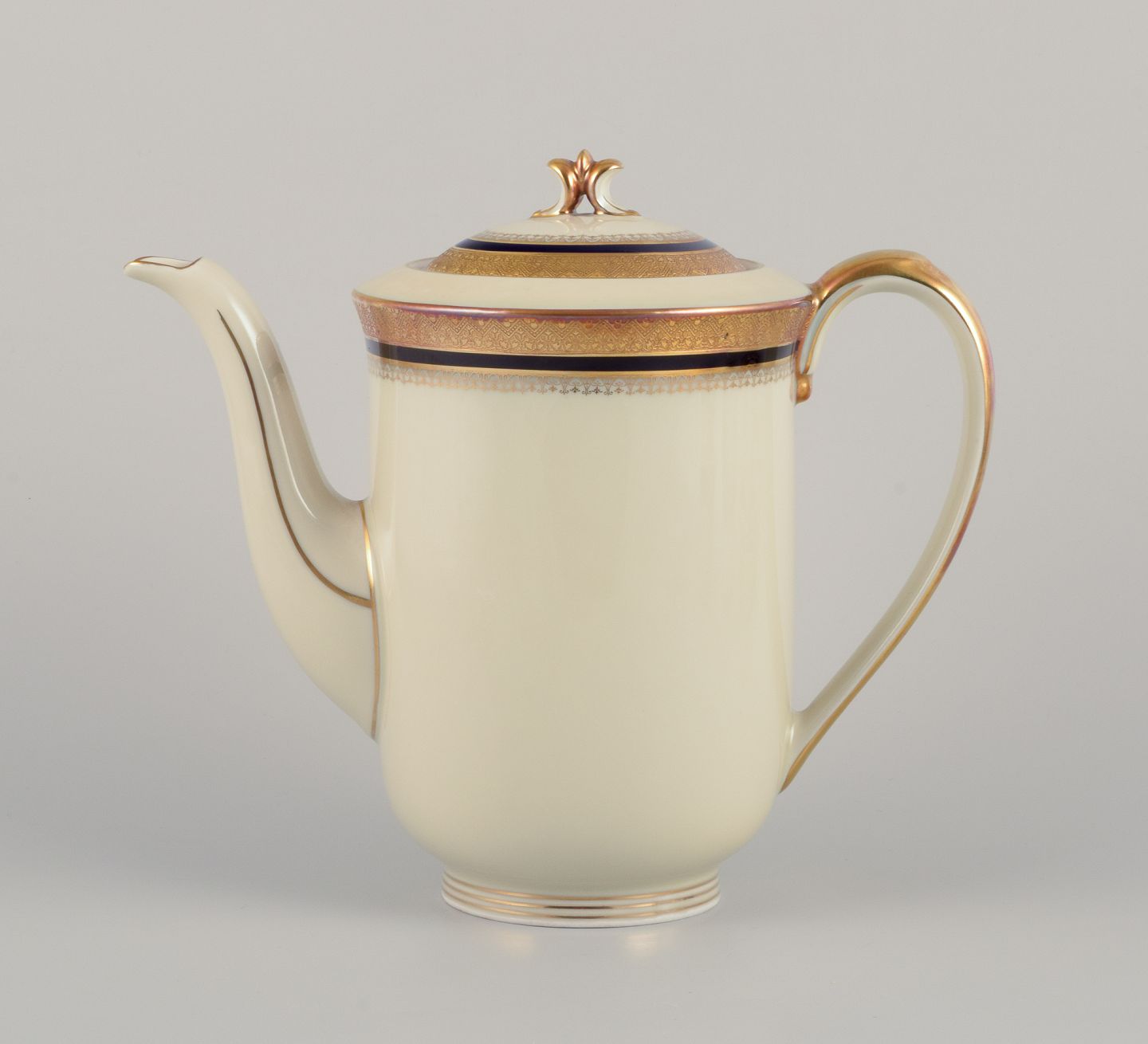 Hutschenreuther, Tyskland. Komplet sekspersoners kaffeservice, bestående af seks store kaffekopper med underkopper, sukkerskål og kaffekande. Fra serien ”Margarete”. Hånddekoreret guld og kongeblå.