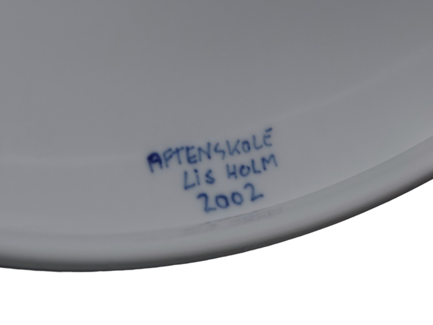 Royal Copenhagen havde en aftenskole, hvor de ansatte kunne øve sig eller lave ting til sig selv. Man brugte Royal Copenhagen porcelæn og maling. Tingene skulle efterfølgende godkendes, og opfyldte de ikke visse kvalitetskrav, så blev de destrueret. Disse ting er mærket med blå skrift: “Aftenskole”. Denne er malet på aftenskole af Lis Holm i 2002. Lis Holm har haft en lang karriere som blåmalerinde hos Royal Copenhagen.