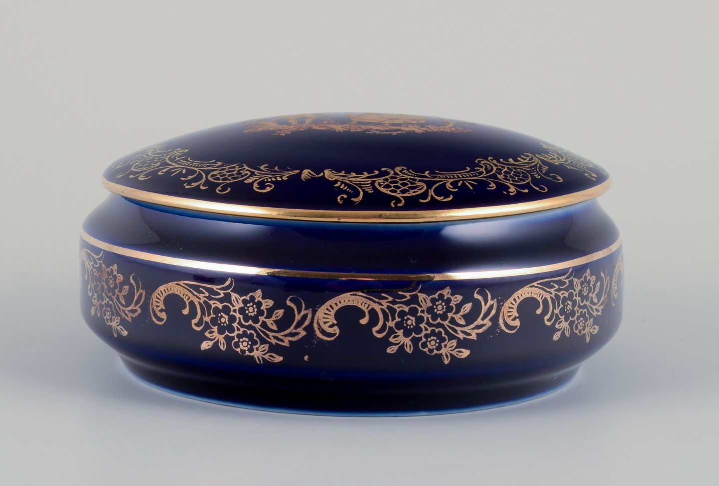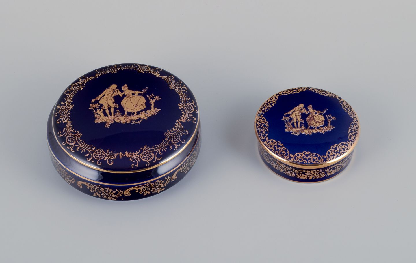 Limoges, Frankrig. To runde lågkrukker i porcelæn. Dekoreret i 22-karat bladguld. Smuk kongeblå glasur. Scène galante.