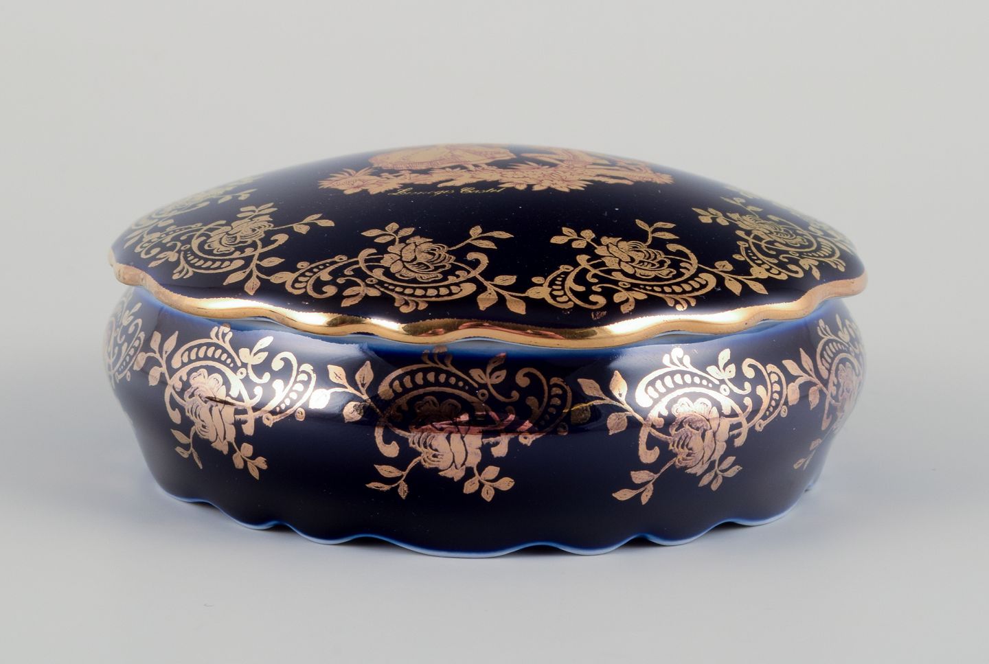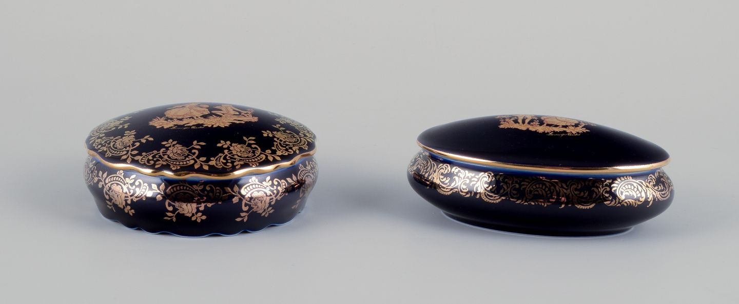 Limoges, Frankrig. To lågkrukker i porcelæn i porcelæn (en oval). Dekoreret i 22-karat bladguld. Smuk kongeblå glasur. Scène galante.