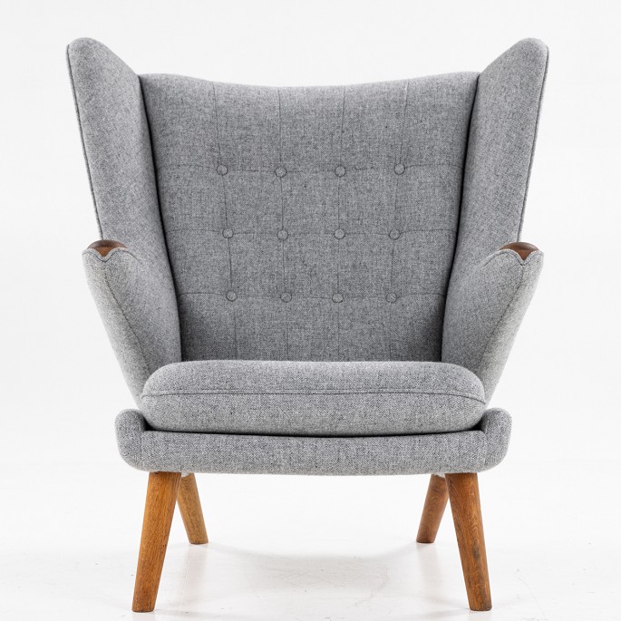 OM MØBLET: Dette er en original ’Bamsestol’ af Hans J. Wegner, som er produceret hos den oprindelige producent; AP Stolen. Stolen er brugt, men er nybetrukket af vores erfarne polstrerværksted i Danmark. Den fremstår som ny og har 2 års garanti. Den tilbydes med læder og/eller tekst