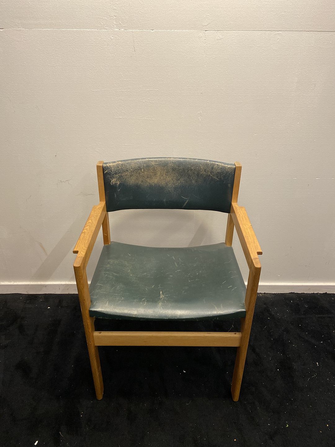 Armstol i eg med læderbetrukket ryg og sæde. Fremstår stabil og ok velholdt dog med lettere brugspor på læder. (billede)