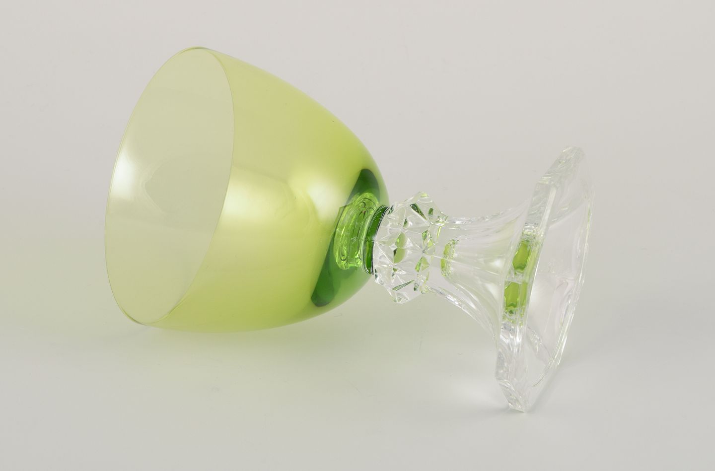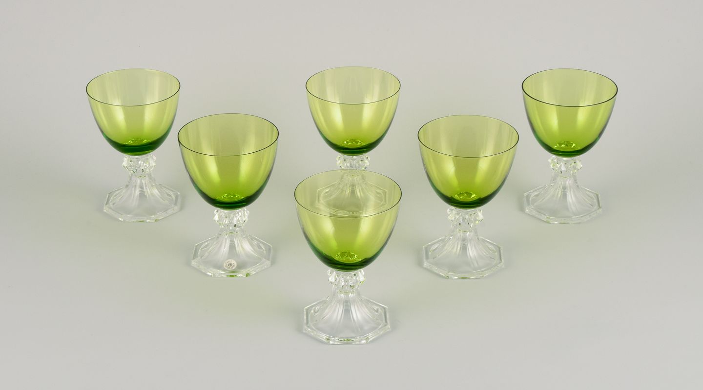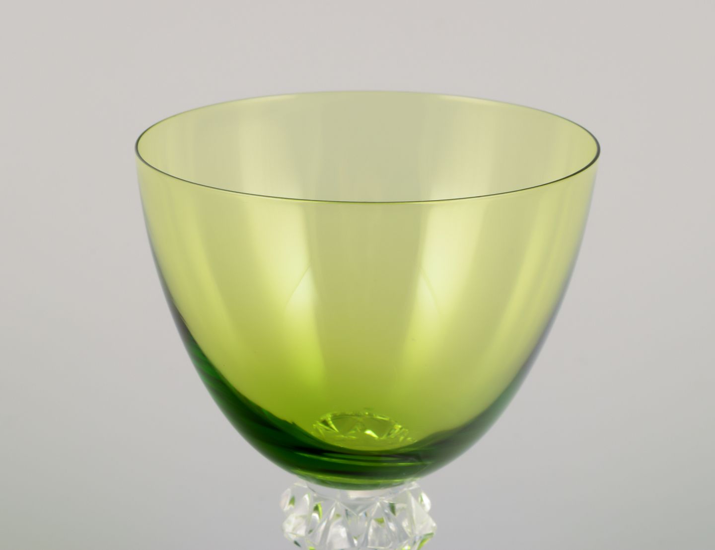Val St. Lambert, Belgien. Et sæt på seks hvidvinsglas i grønt og klart mundblæst krystalglas.