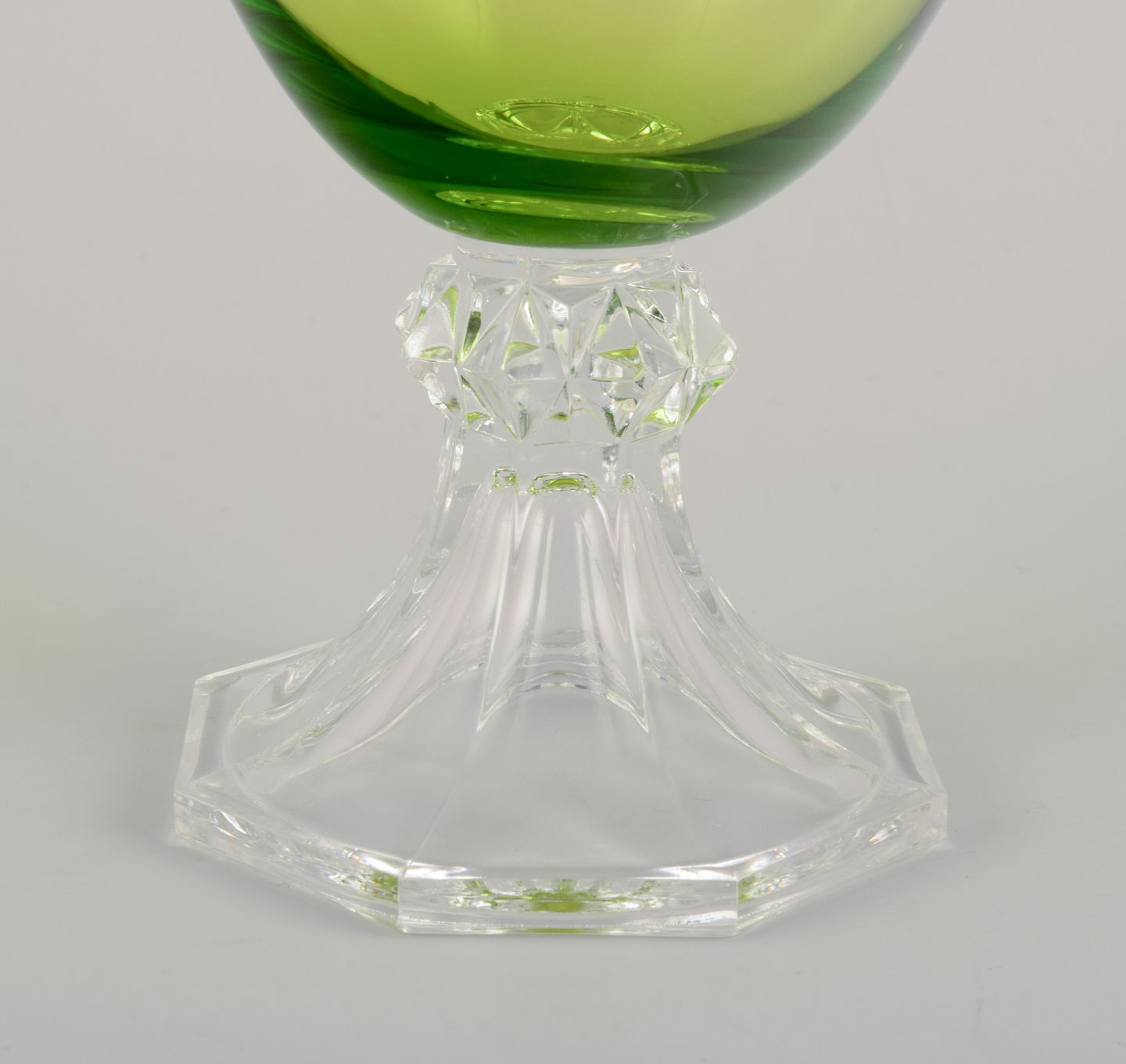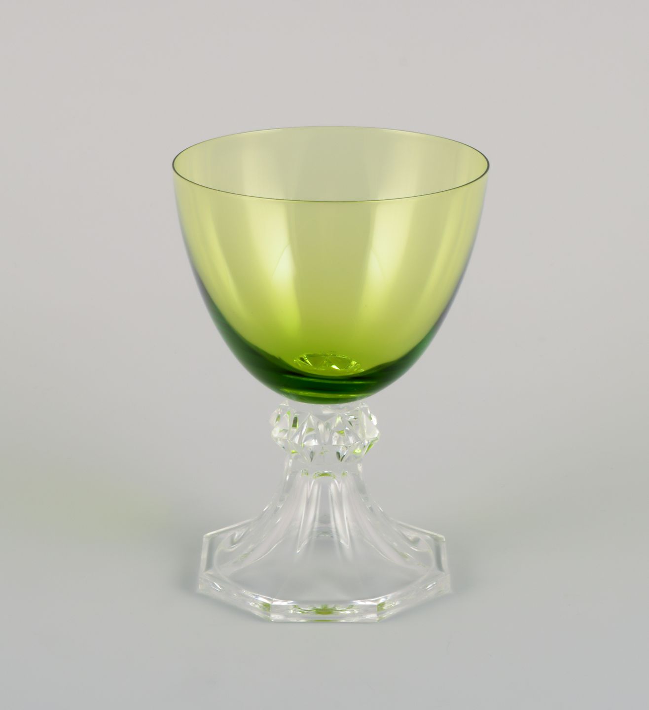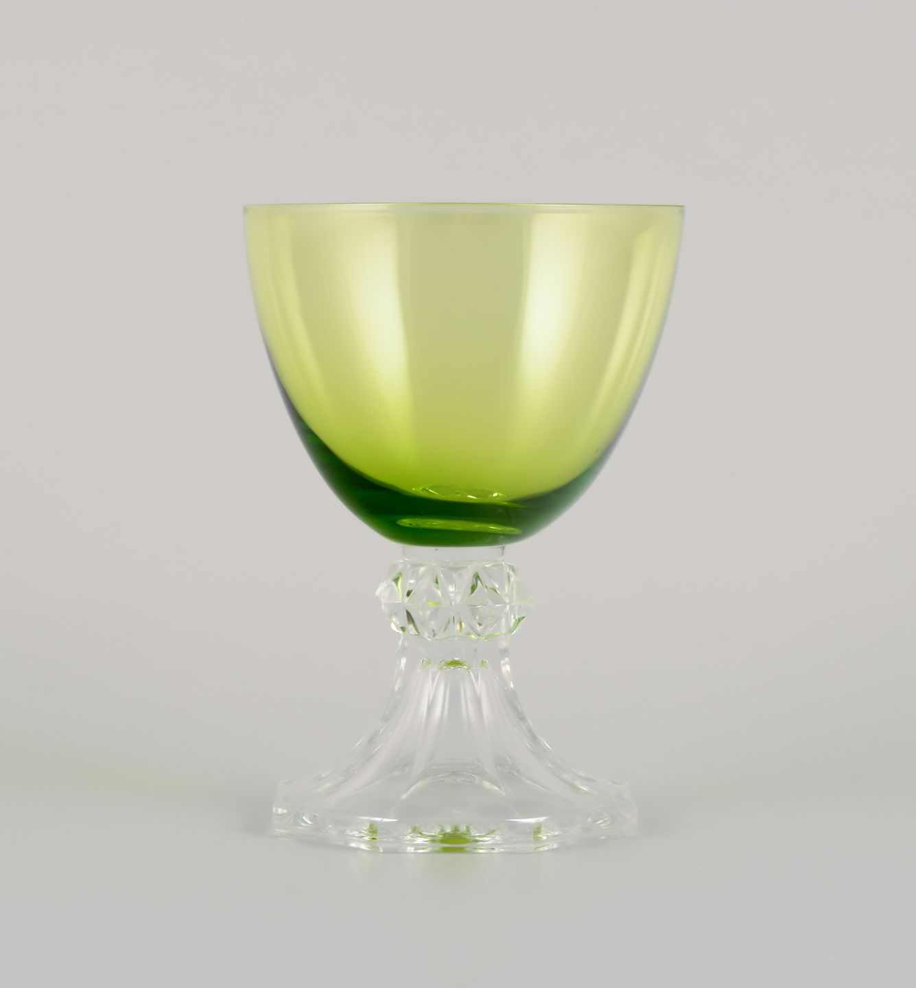 Val St. Lambert, Belgien. Et sæt på seks hvidvinsglas i grønt og klart mundblæst krystalglas.