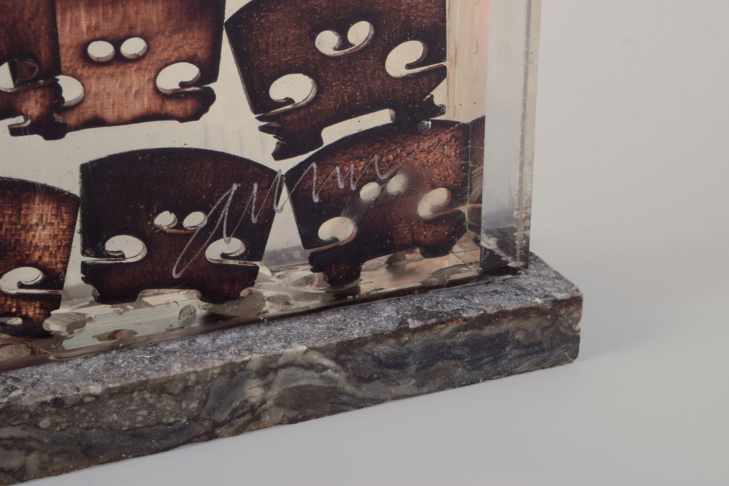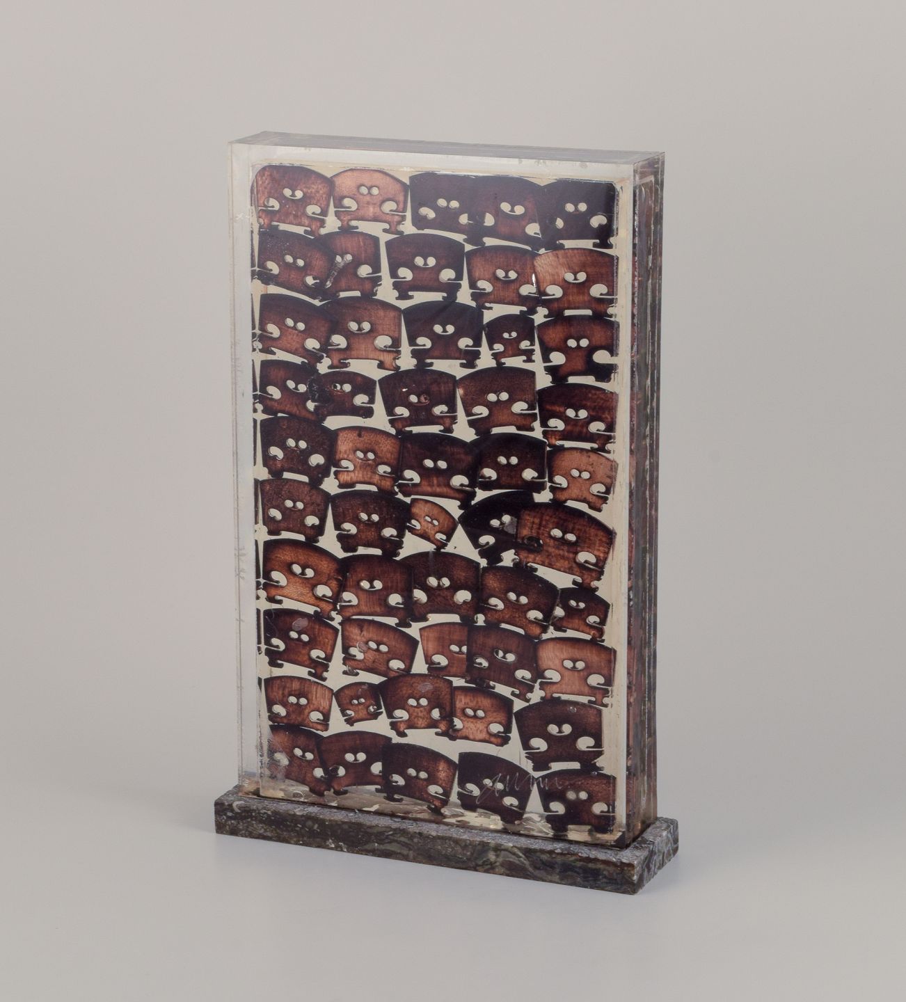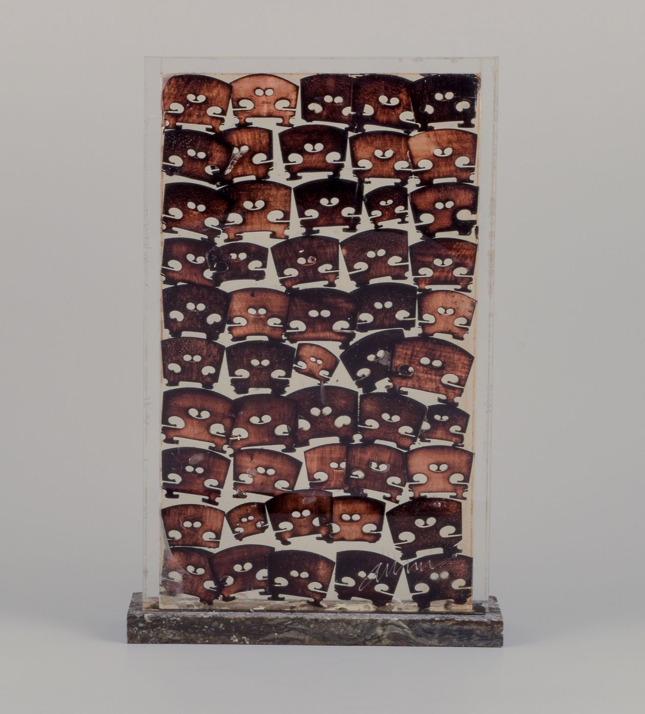 Fernandez Arman (1970–1993). Akkumulation af brændte træ-violin-broer i resin, ramme af plexiglas. Sokkel i norsk Porsgrunn marmor.