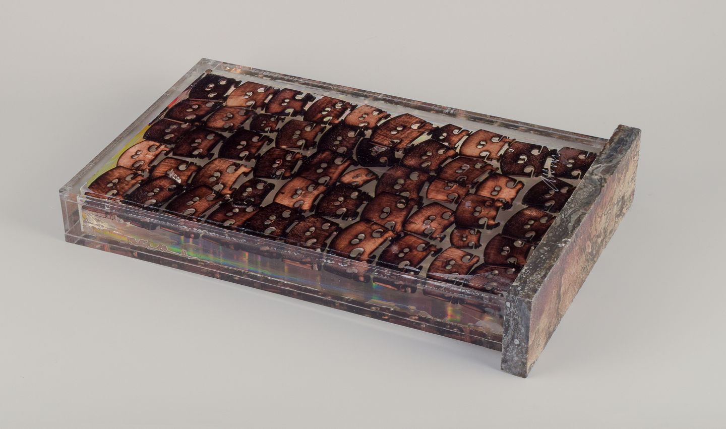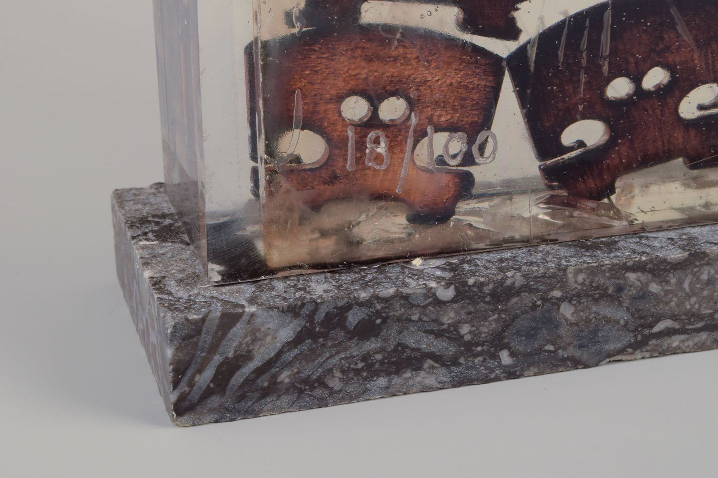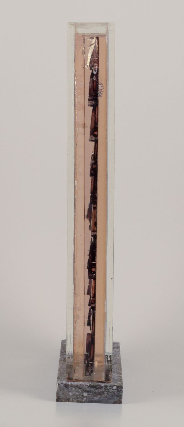 Fernandez Arman (1970–1993). Akkumulation af brændte træ-violin-broer i resin, ramme af plexiglas. Sokkel i norsk Porsgrunn marmor.