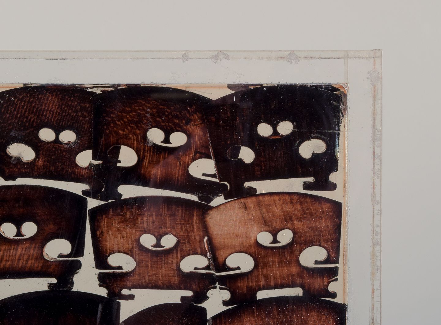 Fernandez Arman (1970–1993). Akkumulation af brændte træ-violin-broer i resin, ramme af plexiglas.