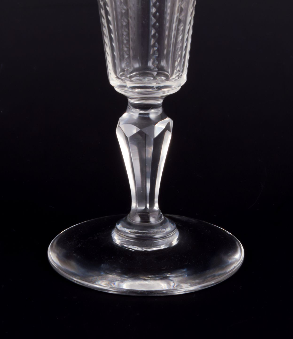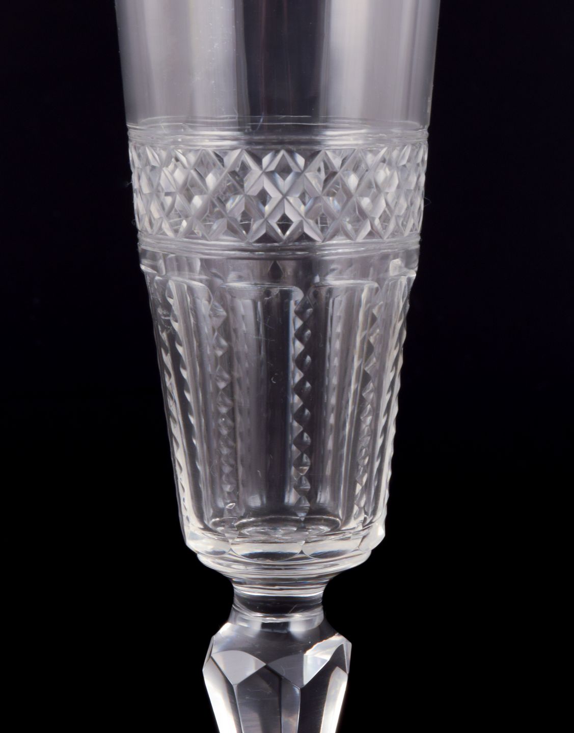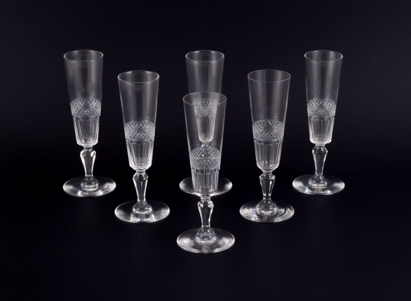 Et sæt på seks mundblæste franske champagnefløjter i krystalglas. Facetslebet. Håndlavet.
