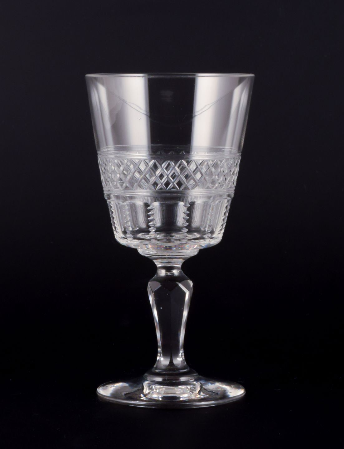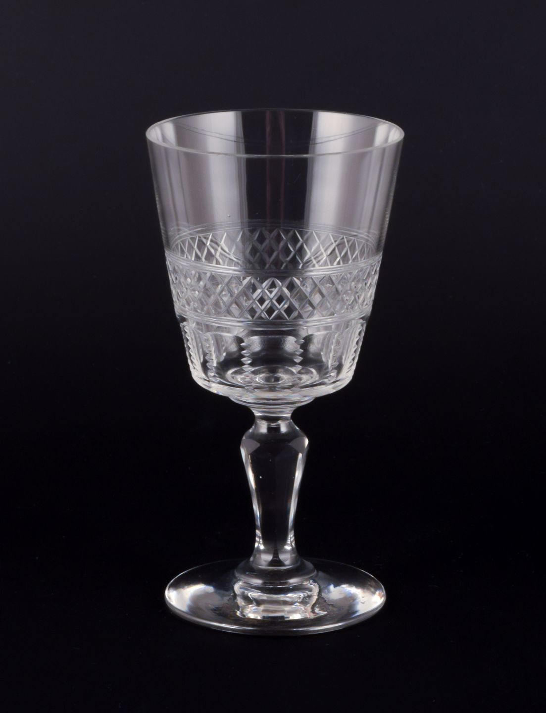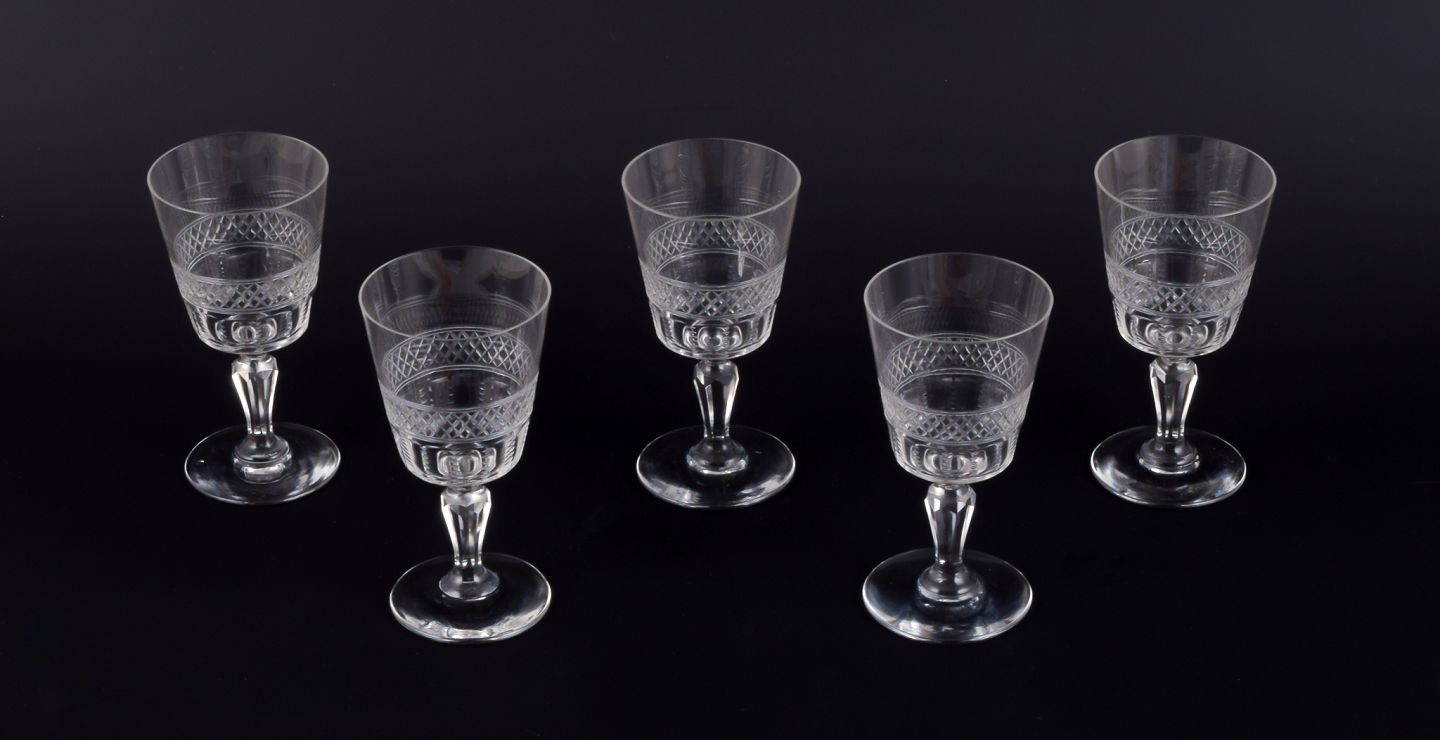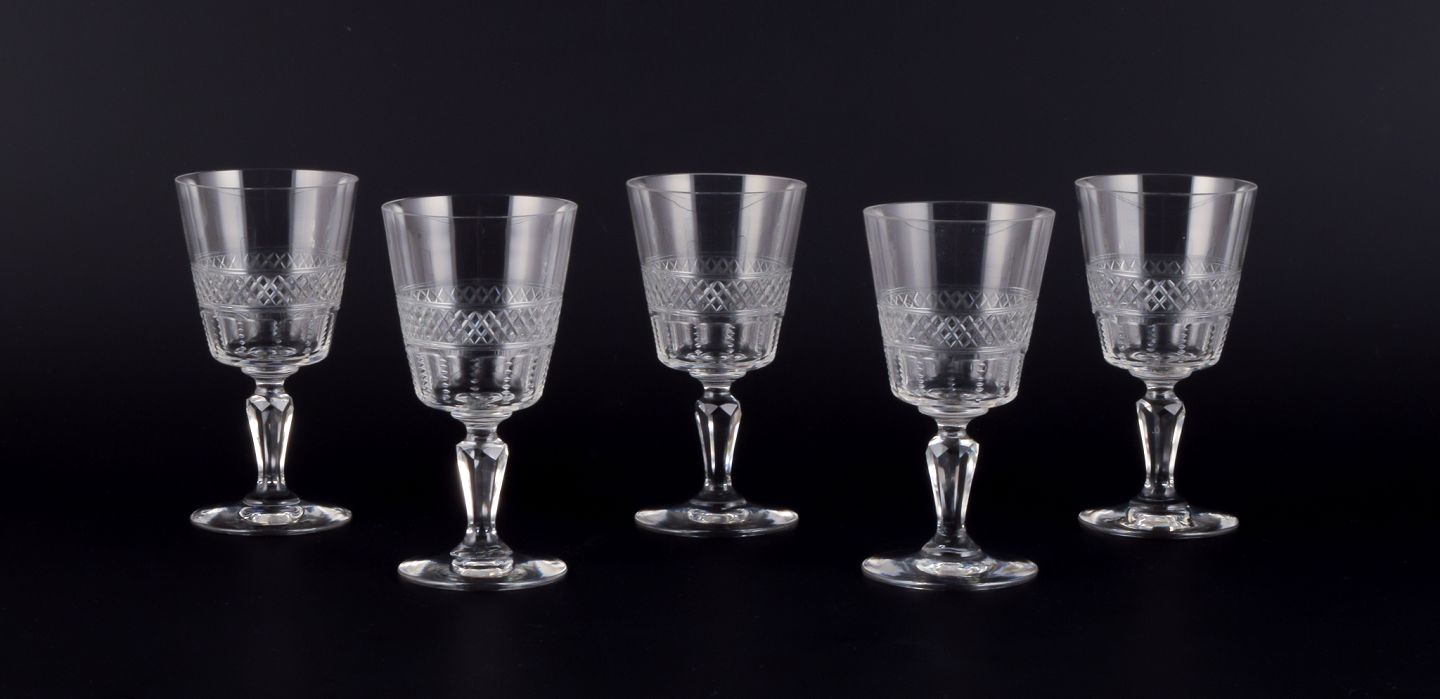 Et sæt på fem mundblæste franske hvidvinsglas i krystalglas. Facetslebet.