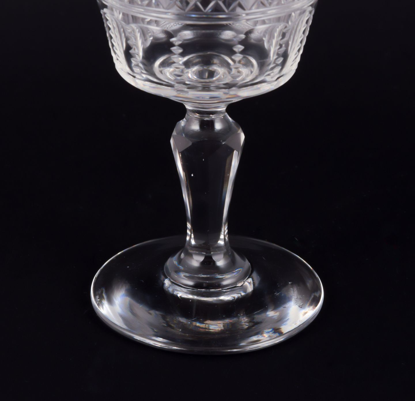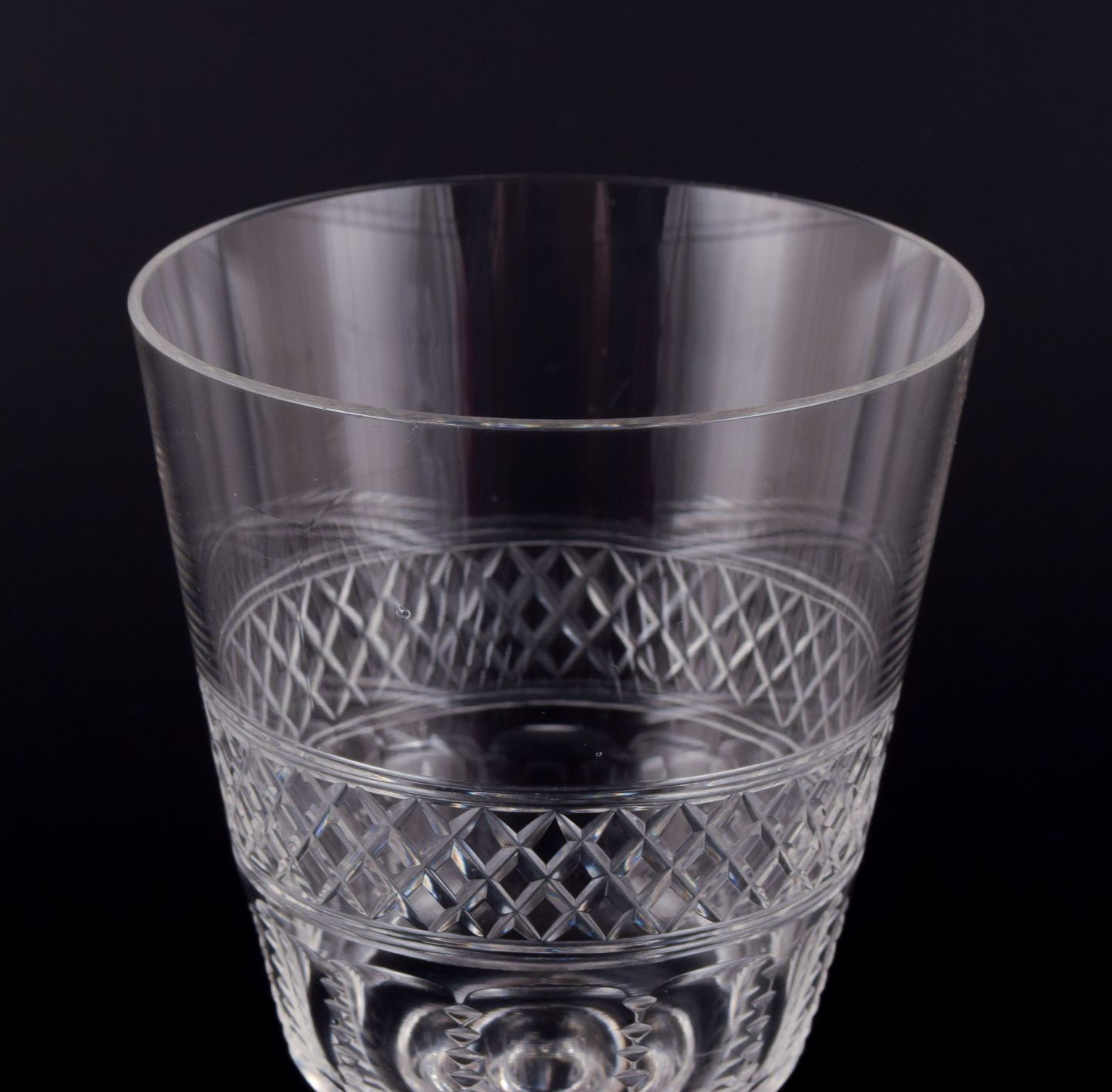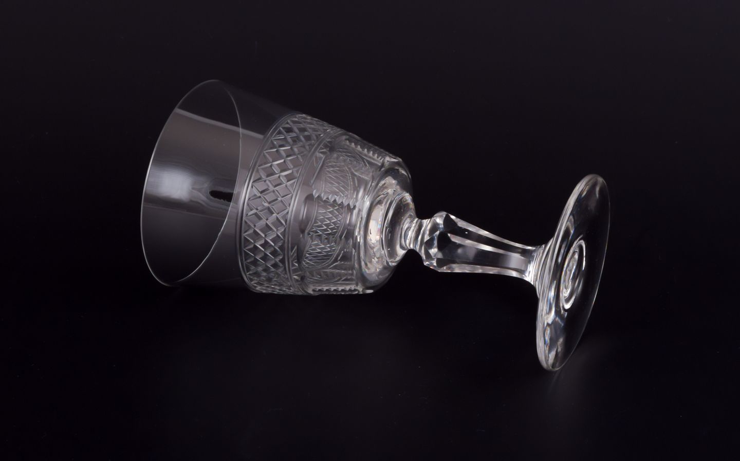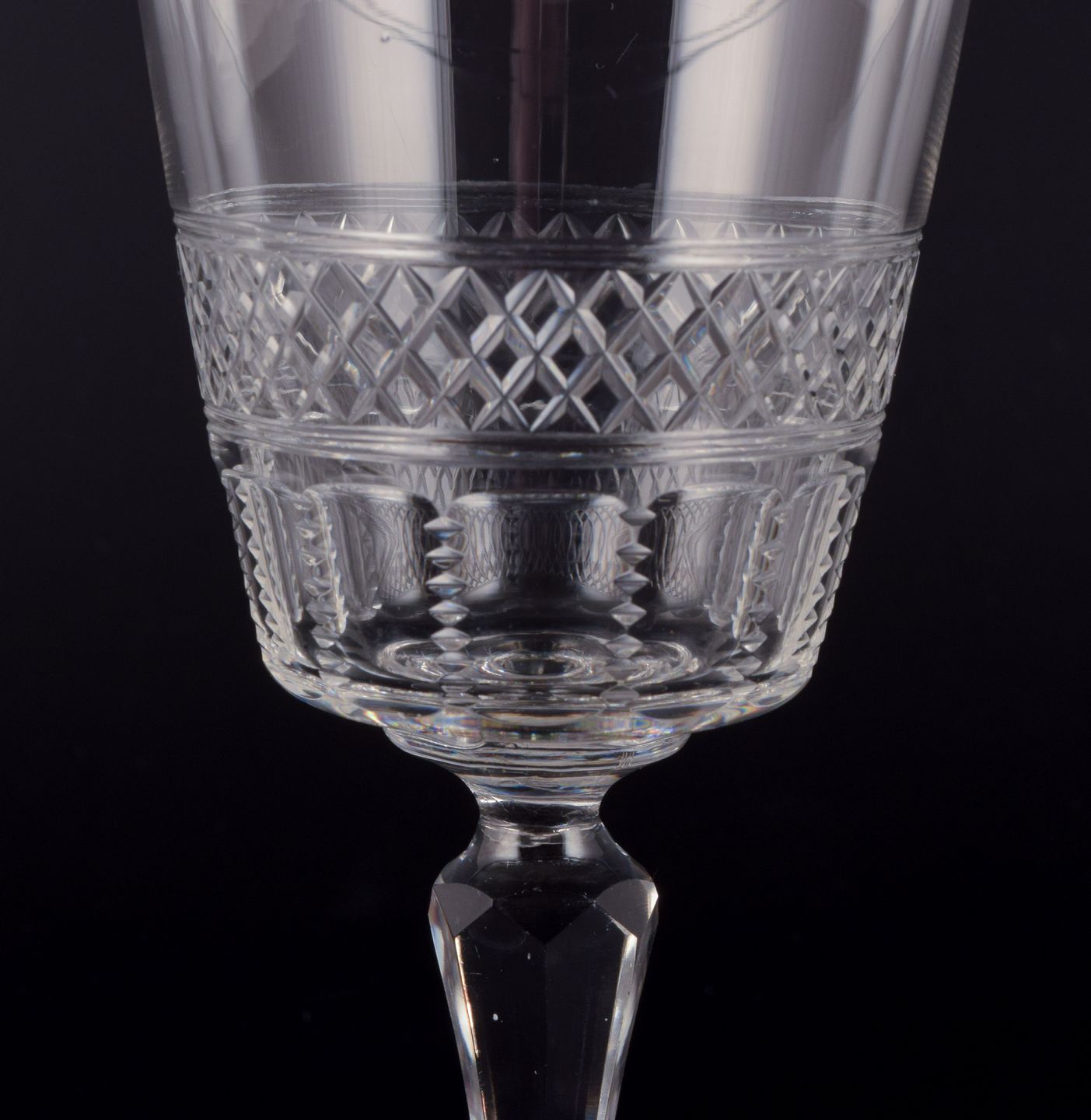 Et sæt på fem mundblæste franske hvidvinsglas i krystalglas. Facetslebet.