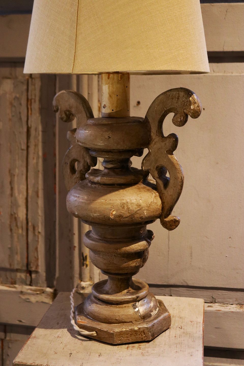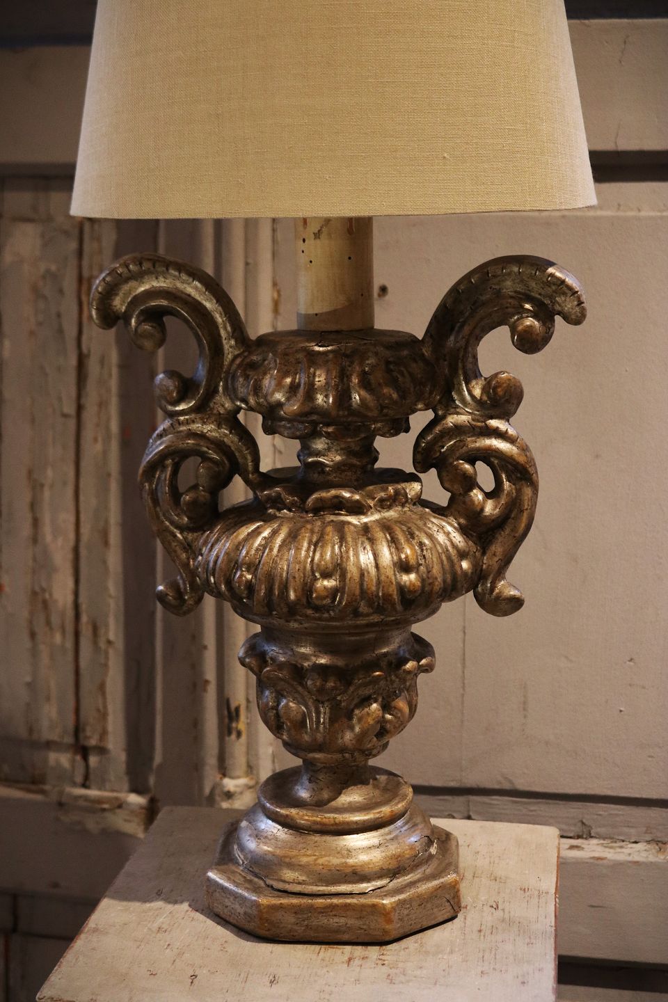 Gammel fransk bordlampe i udskåret træ med sølvbelægning med en rigtig fin patina...