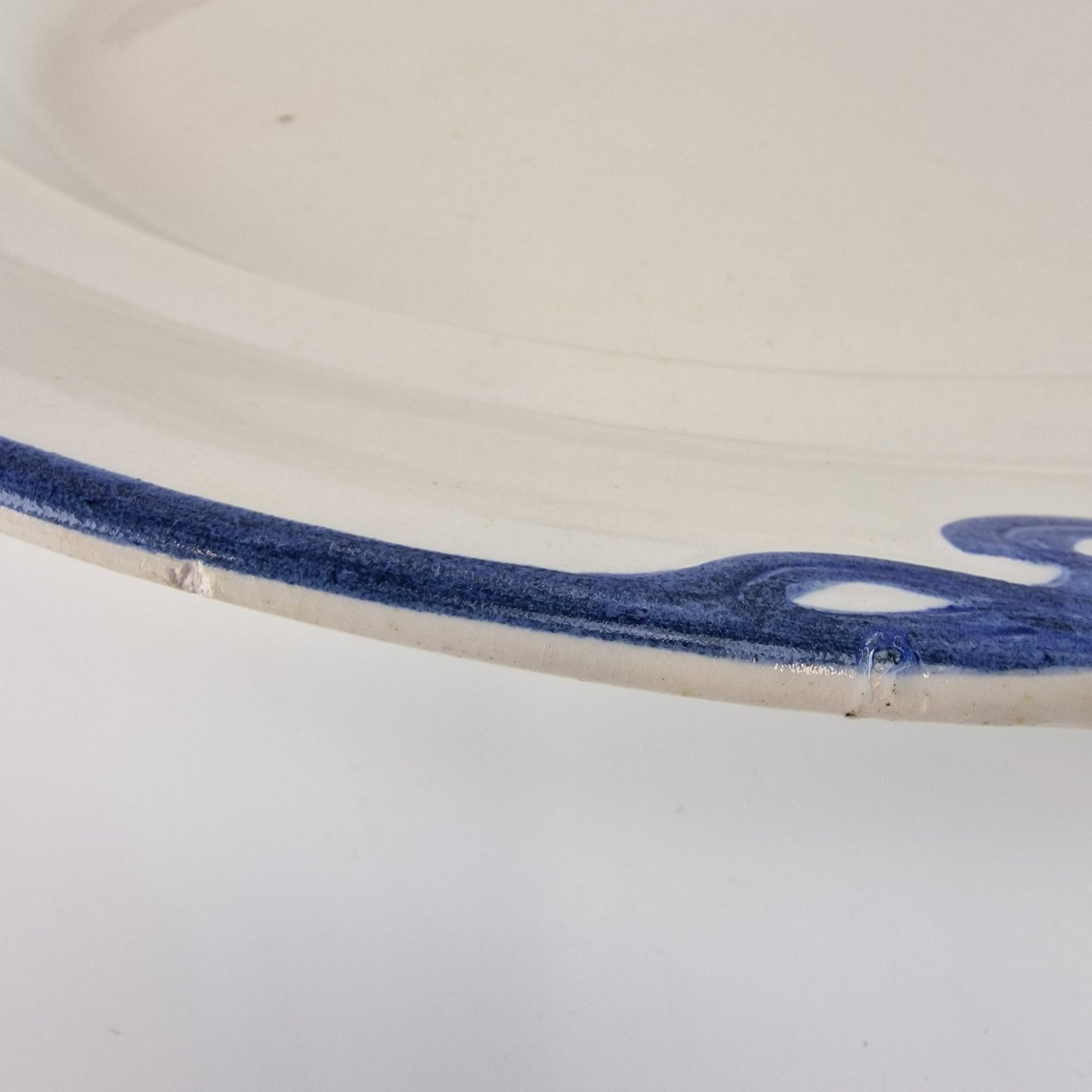 Blå Olga er hvid fajance dekoreret med blå abstrakt mønster langs kanten