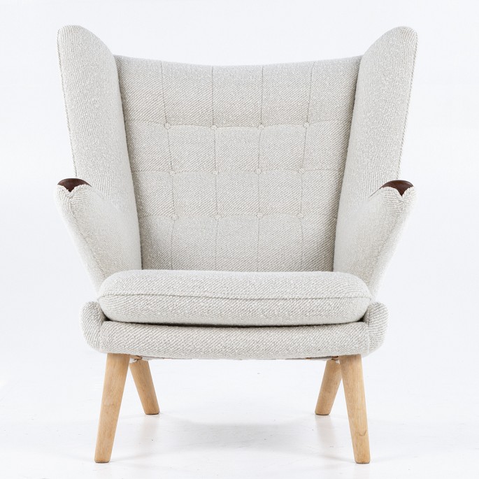 OM MØBLET: Dette er en original ’Bamsestol’ af Hans J. Wegner, som er produceret hos den oprindelige producent; AP Stolen. Stolen er brugt, men er nybetrukket af vores erfarne polstrerværksted i Danmark. Den fremstår som ny og har 2 års garanti. Den tilbydes med læder og/eller tekstil
