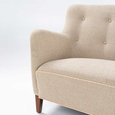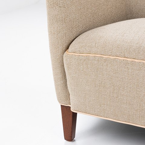Overpolstret sofa i nyt Ecriture-tekstil (farve 0240) med kedere i naturlæder.