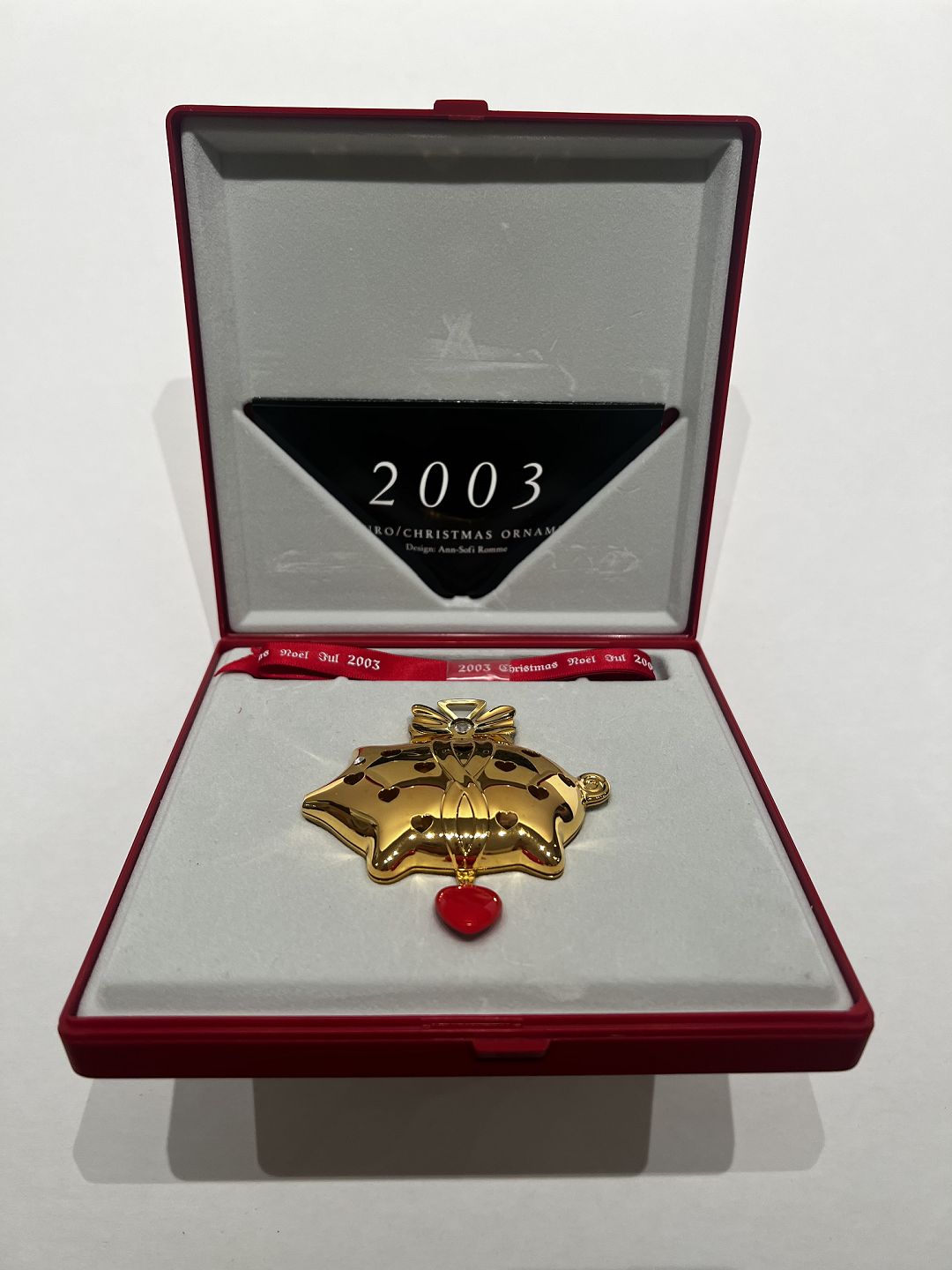 Georg Jensen's Christmas Uno from 2003, created by Ann-Sofi Romme and featuring the motif of a Christmas pig, is truly a charming and unique addition to the Christmas collection. This Christmas bauble is plated with 24 carat gold, which adds a sense of elegance and luxury to this fine piece of Christmas decoration.
