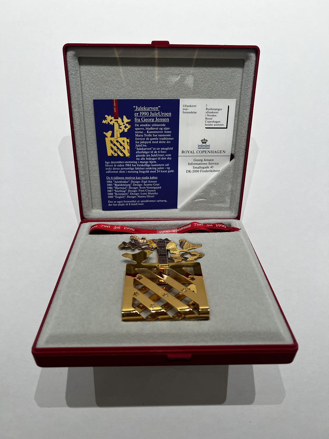 Georg Jensens forgyldte juleuro fra 1990, designet af Marie Trolle med motivet af en julekurv, er ikke bare et stykke julepynt; det er et symbol på generøsitet og festligheder, der tilføjer en smuk og traditionel stemning til enhver juleudsmykning.