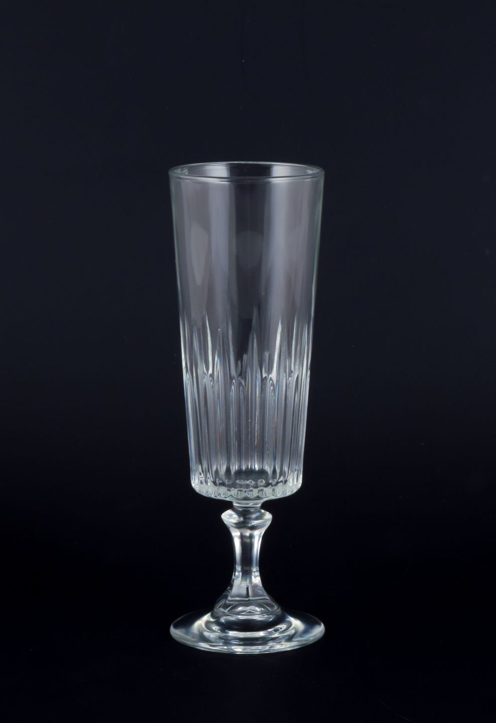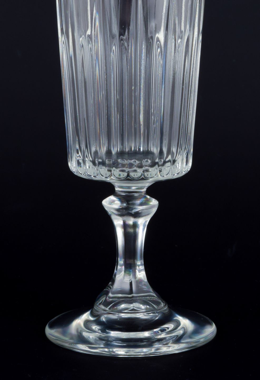A set of six Swedish Champagne flutes in clear glass. Faceted.