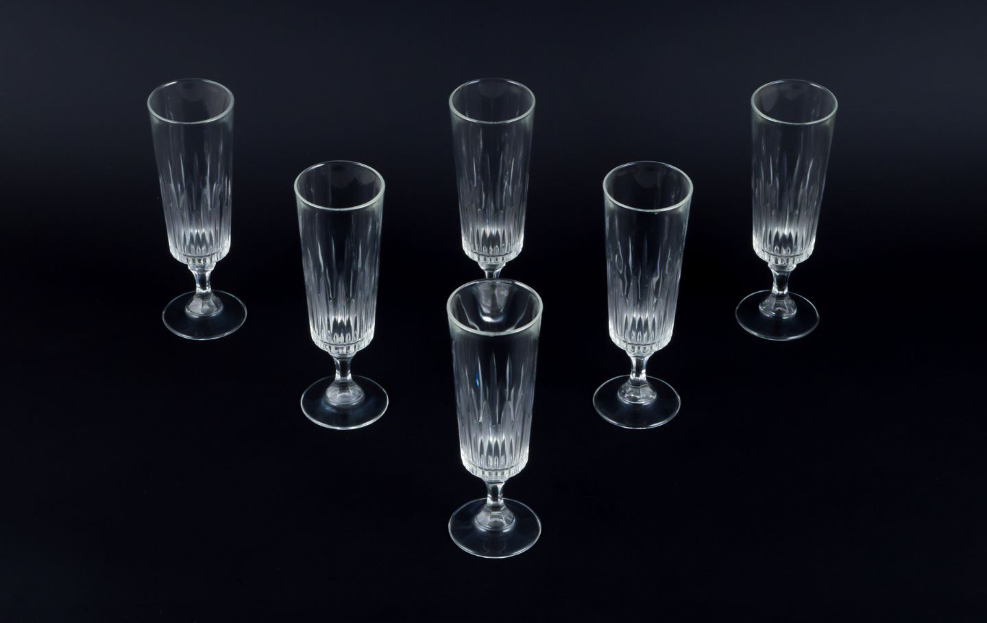 Et sæt på seks svenske champagnefløjter i klart glas. Facetslebet.