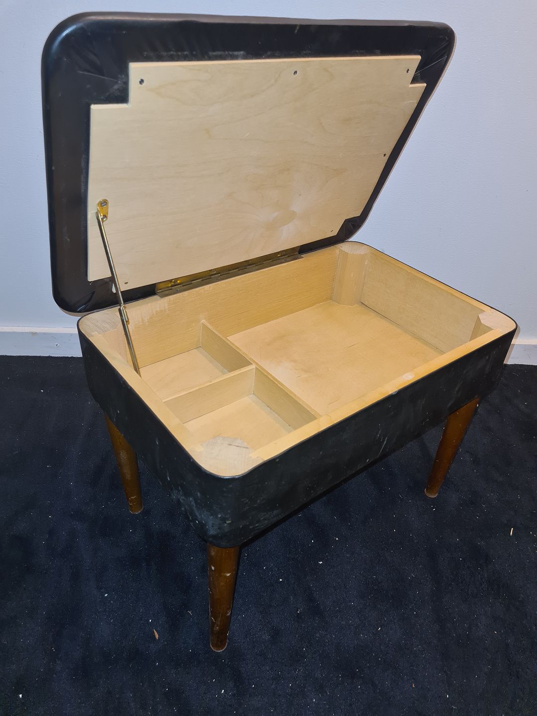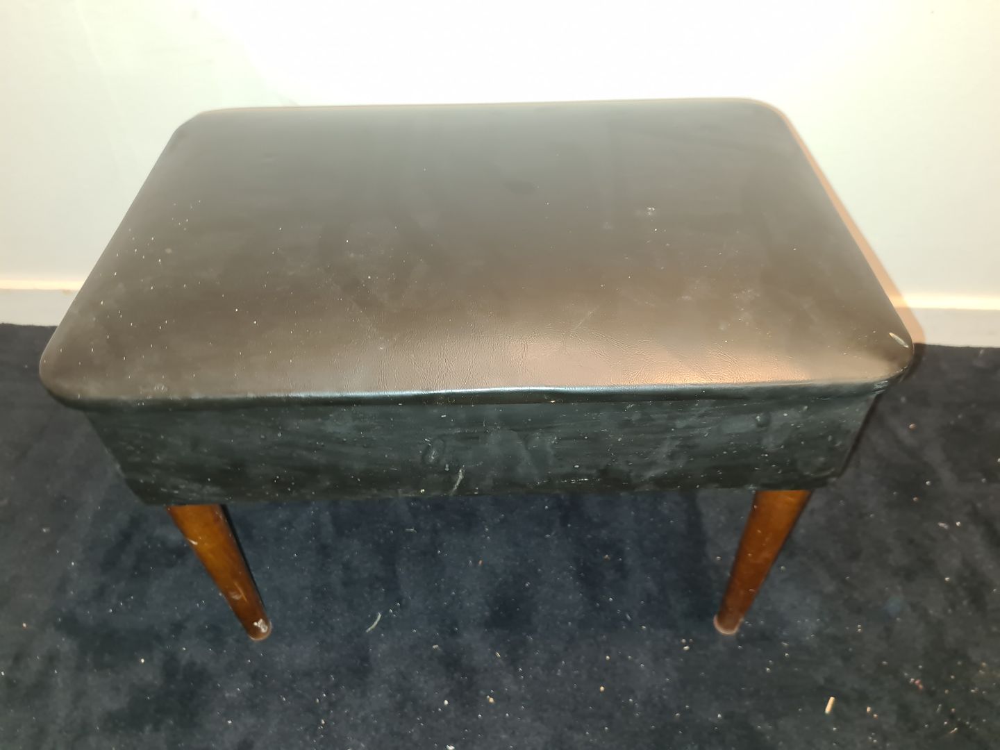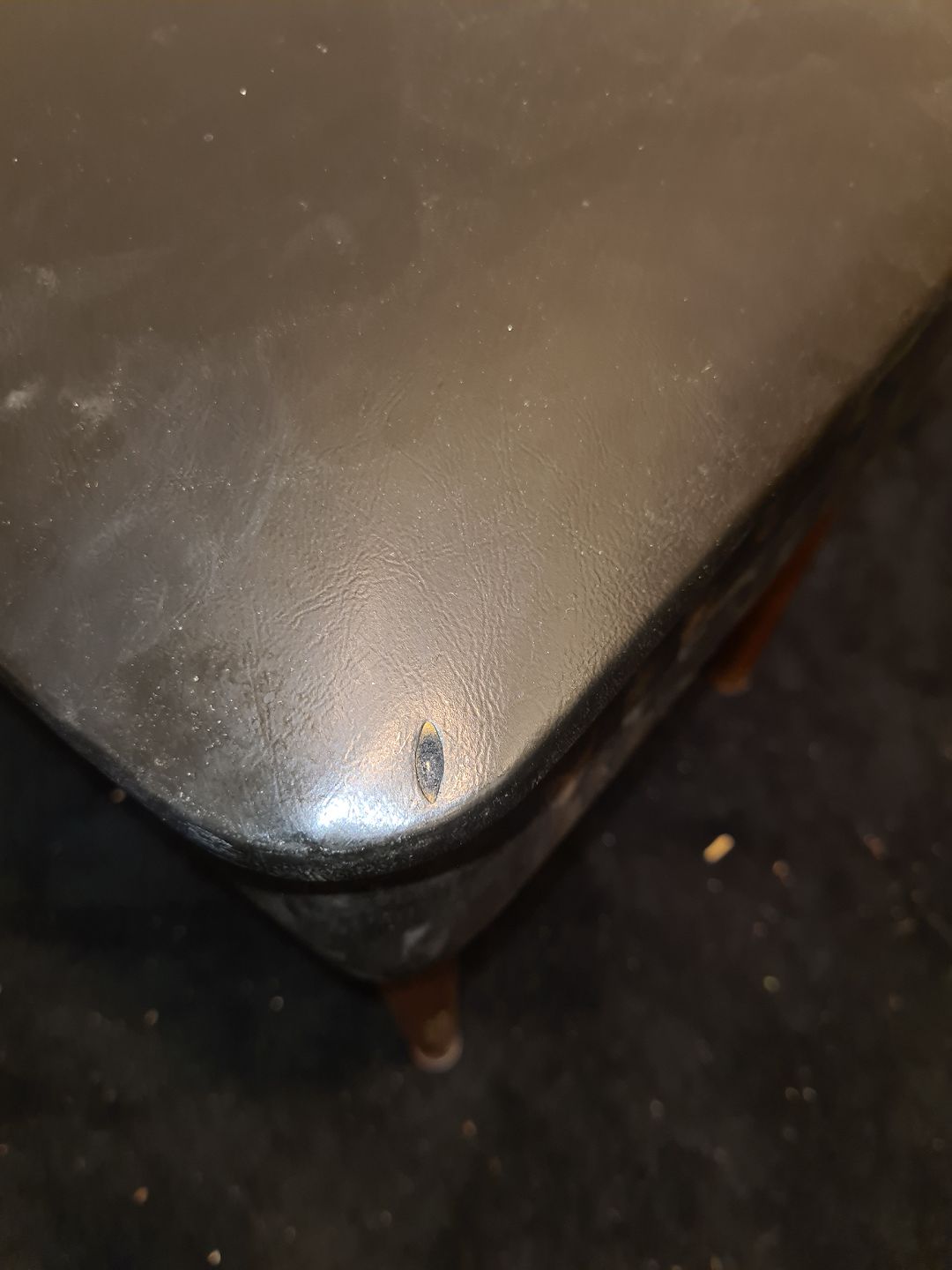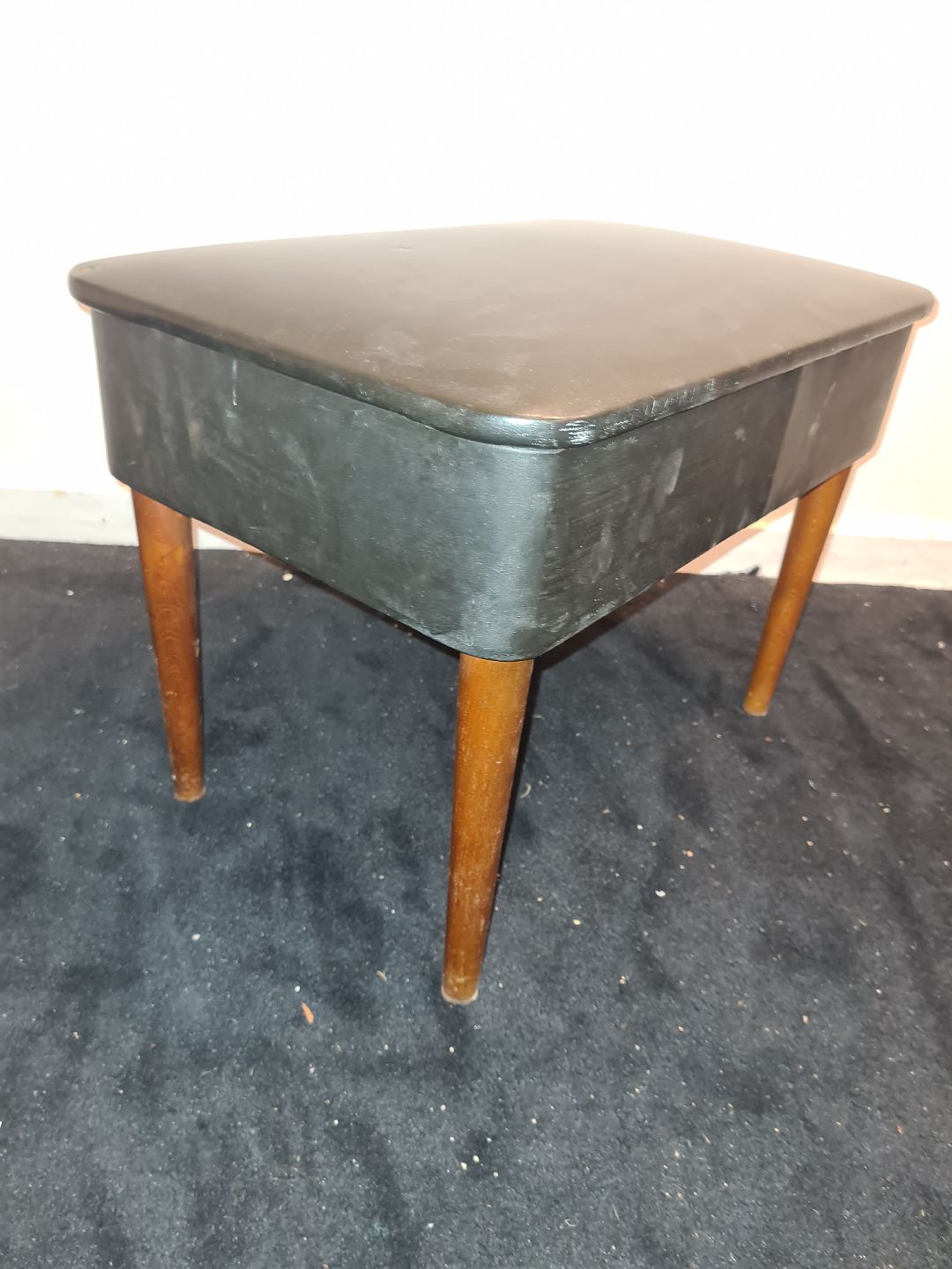 Nappabetrukket fodskammel med opbevaringsrum. Fremstår funktionel og udmærket stabil dog med hul i nappaen. (billede)