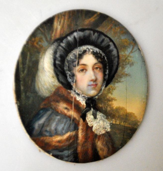 Ubekendt kunstner (19. årh): Portræt af ung kvinde. Miniature maleri. Olie på elfenben. Oval. 10 x 9 cm.