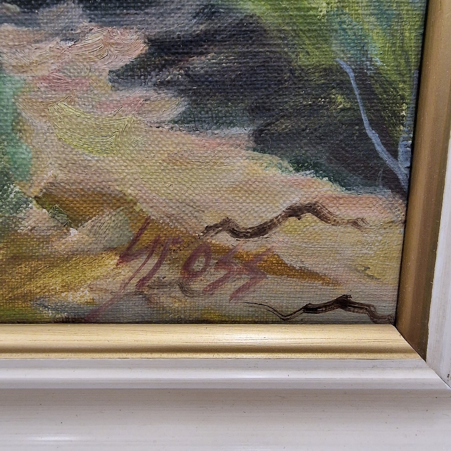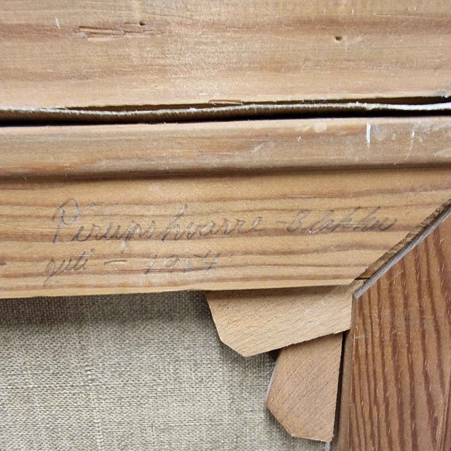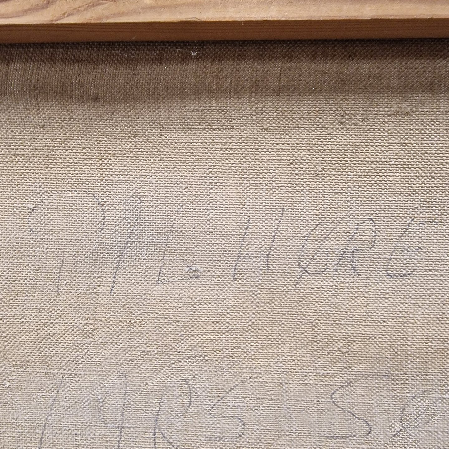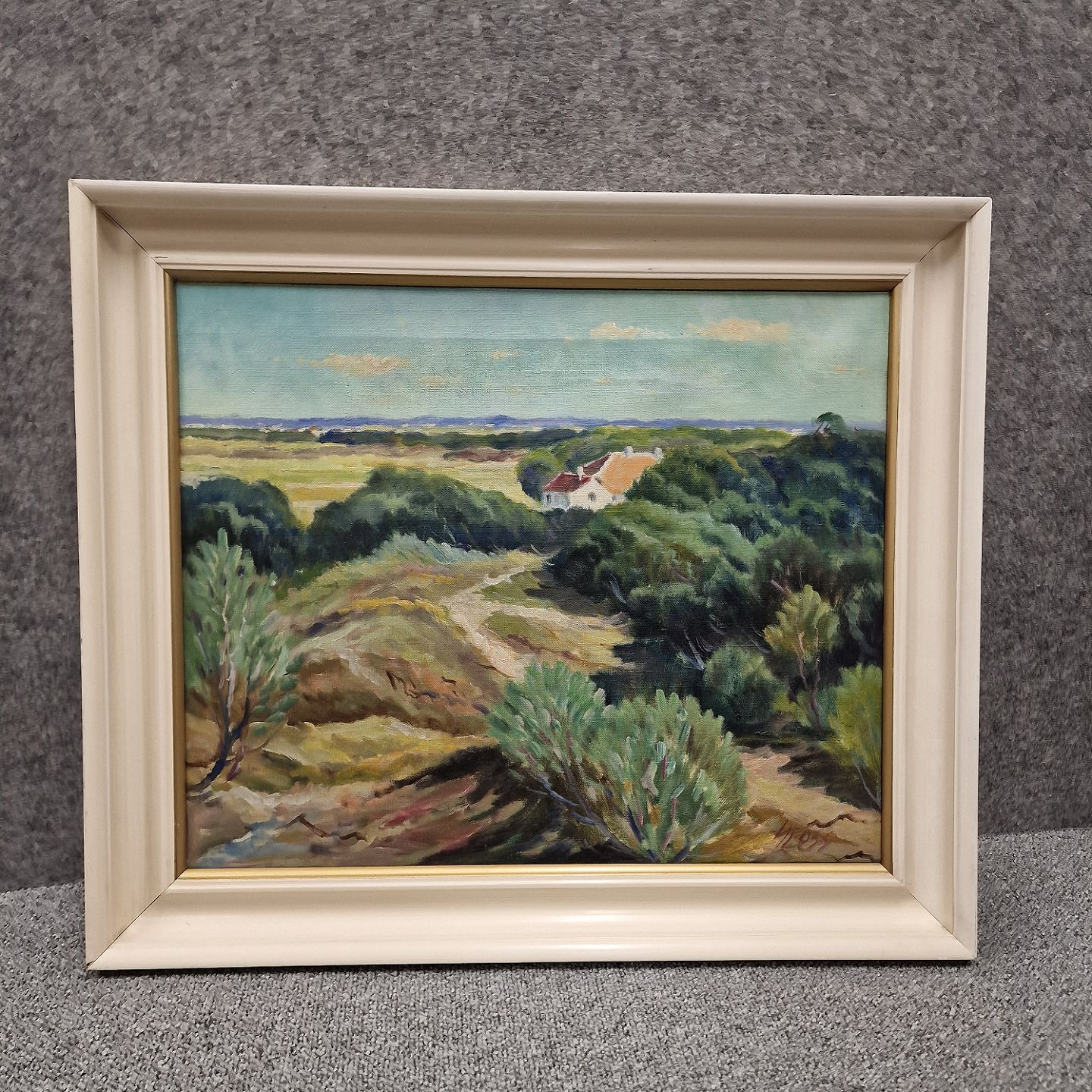 Text available in Danish: Oliemaleri på lærred i lys træramme. Landskabsmaleri af Piruphvarres bakker ved Saltum, juli 1954, med motiv af sti gennem hedeområde til nærliggende huse