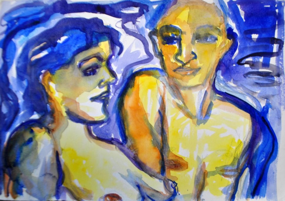 Degett, Karen (1954 - 2011) Danmark: En kvinde og en mand. Usigneret. Akvarel. 37 x 54.