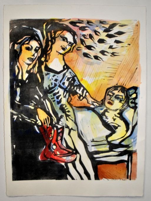 Degett, Karen (1954 - 2011) Danmark: Komposition. Håndkoloreret træsnit. Unika. Usigneret. 54 x 39 cm.