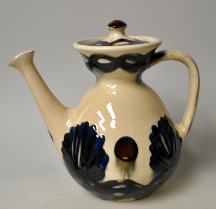 Herman A. Kähler thekande, 1930'erne, Næstved, Danmark. Med blå, sorte og røde glasurer på creme farvet bund. Signeret. H.: 17 cm.