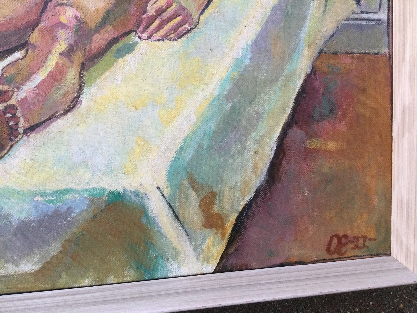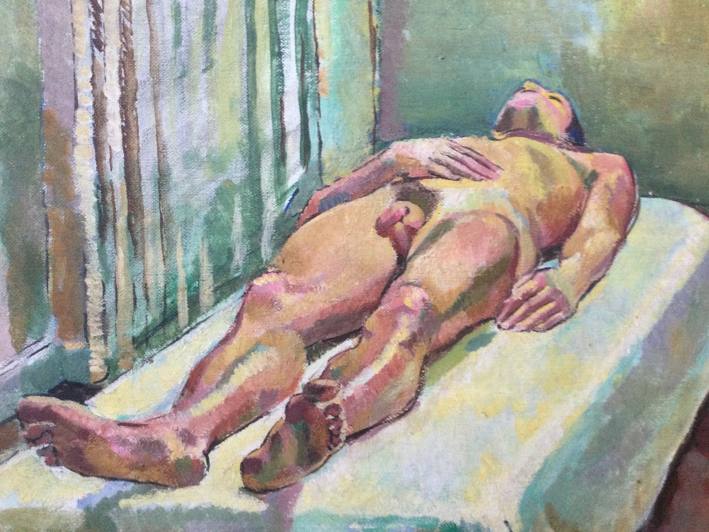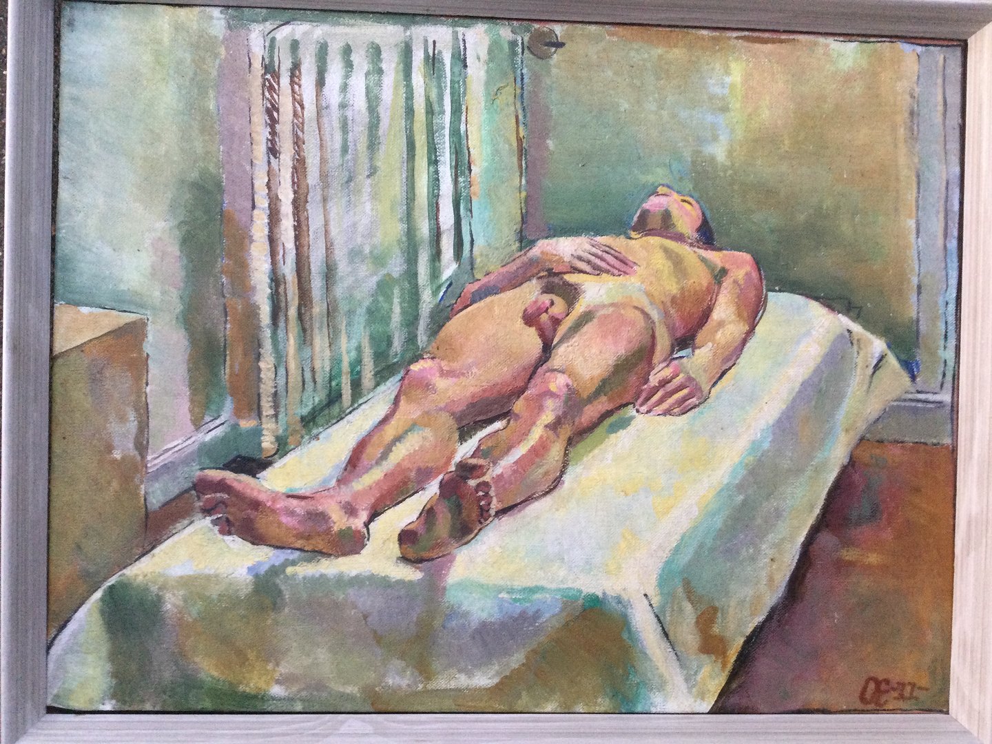 Maleri af Ole Ernst - Nøgen mand på bord 1977.