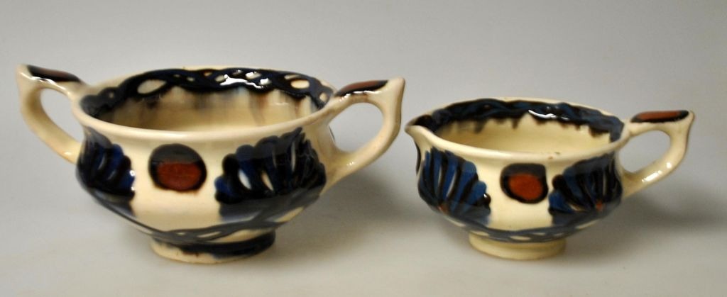 Herman A. Kähler sukker/fløde sæt, 1930'erne, Næstved, Danmark. Med blå, sorte og røde glasurer på creme farvet bund. Signeret. H.: 7 - 9 cm.