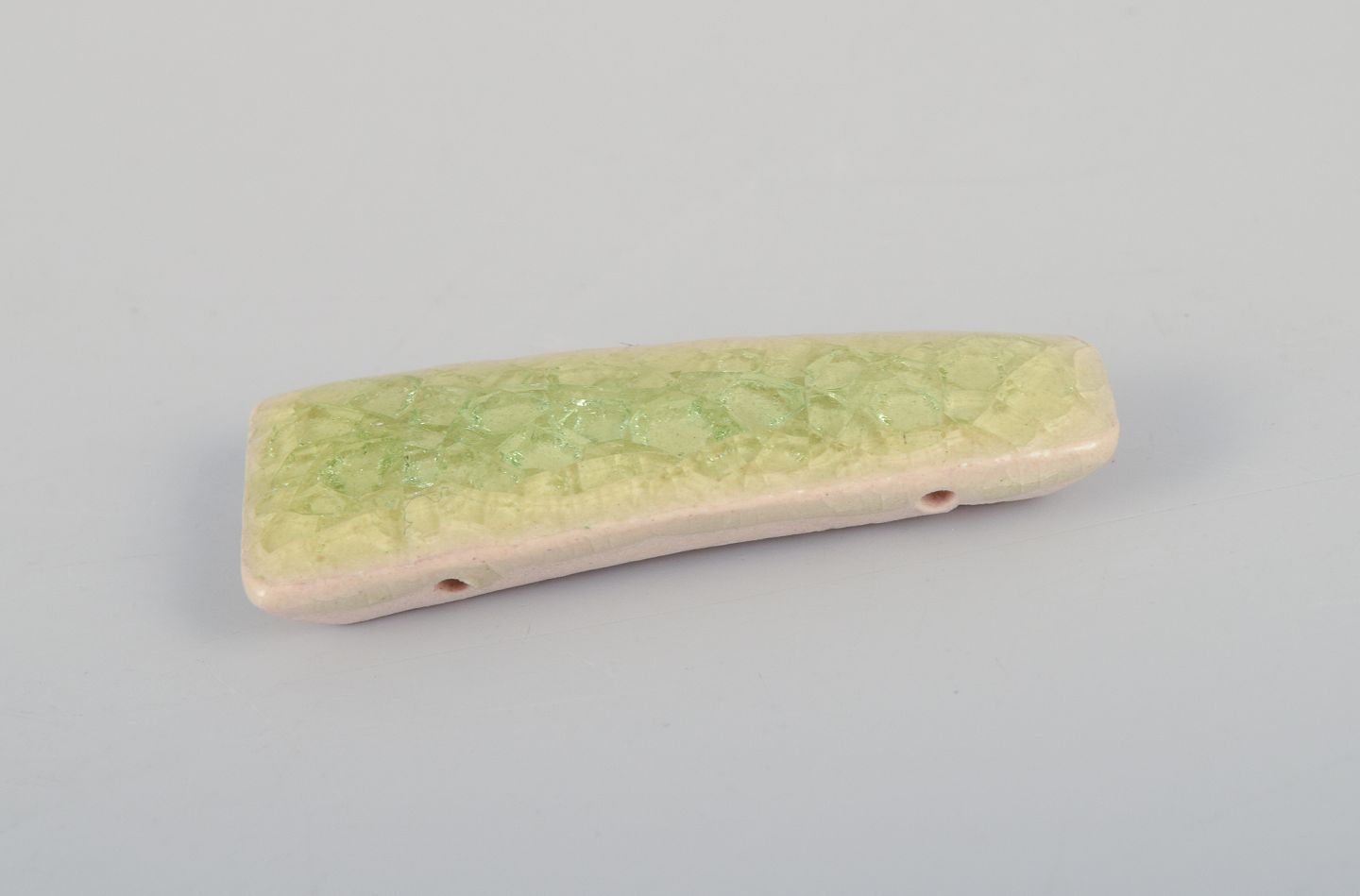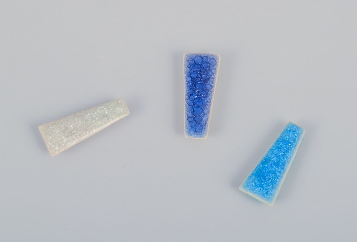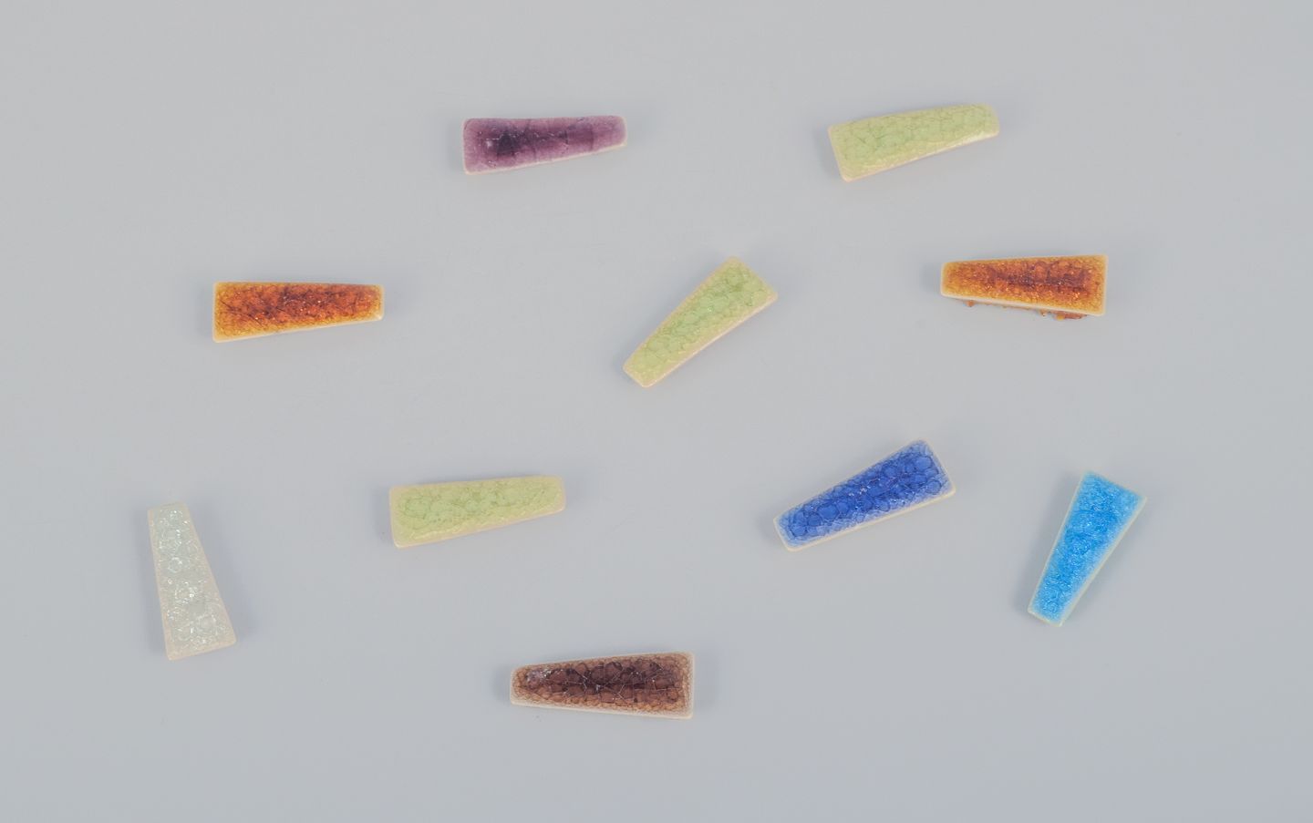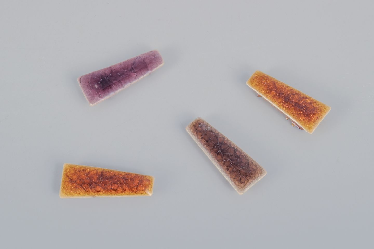 Ti unika brocher i glaseret stentøj i forskellige farver.