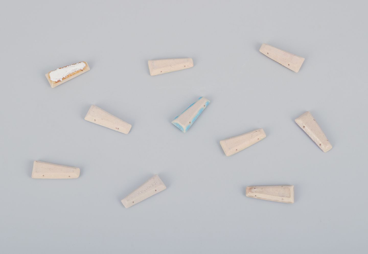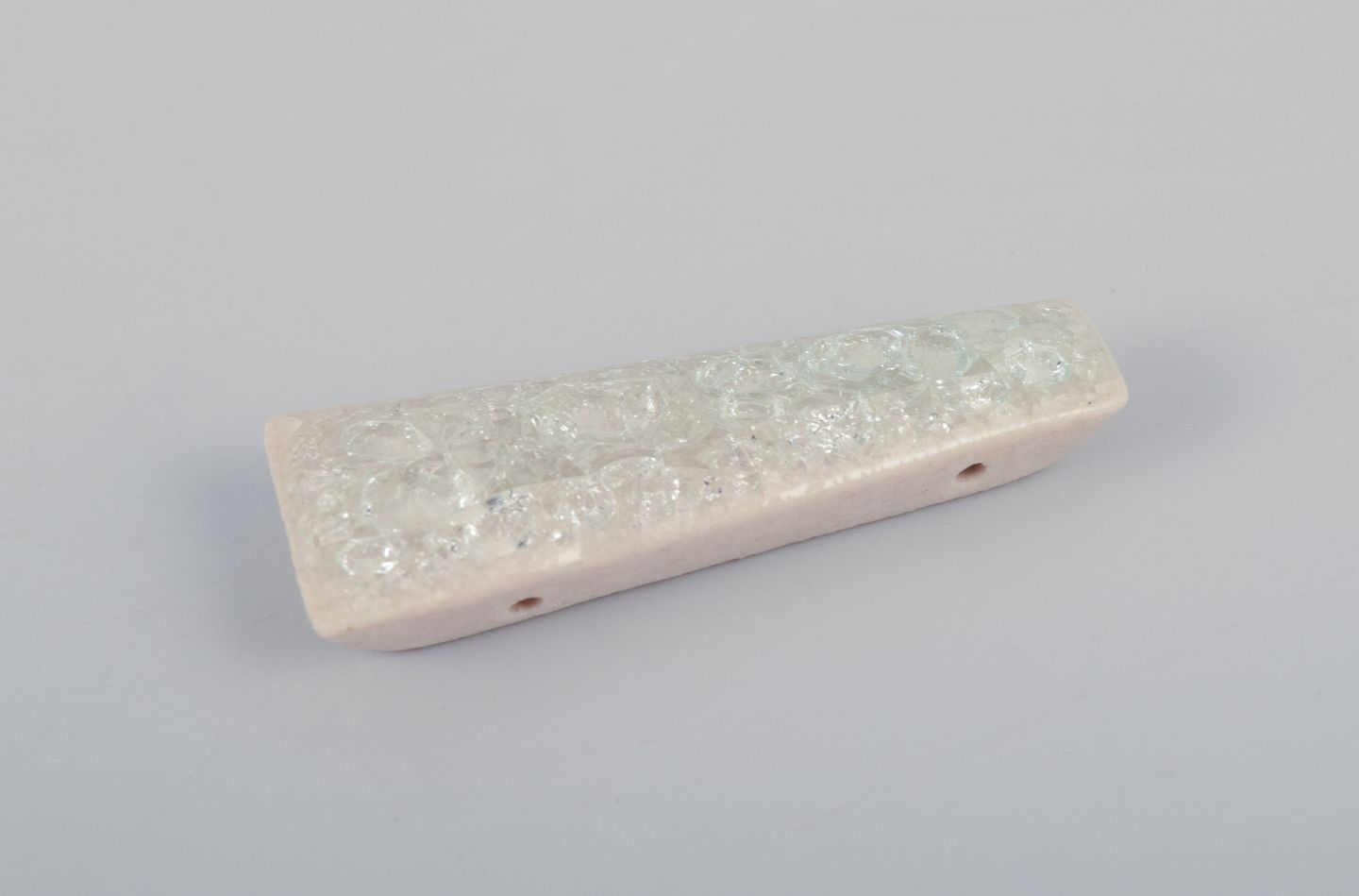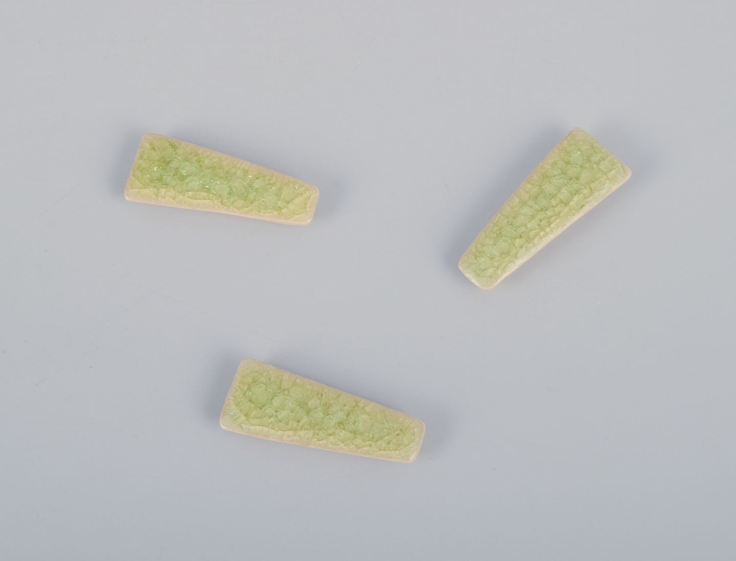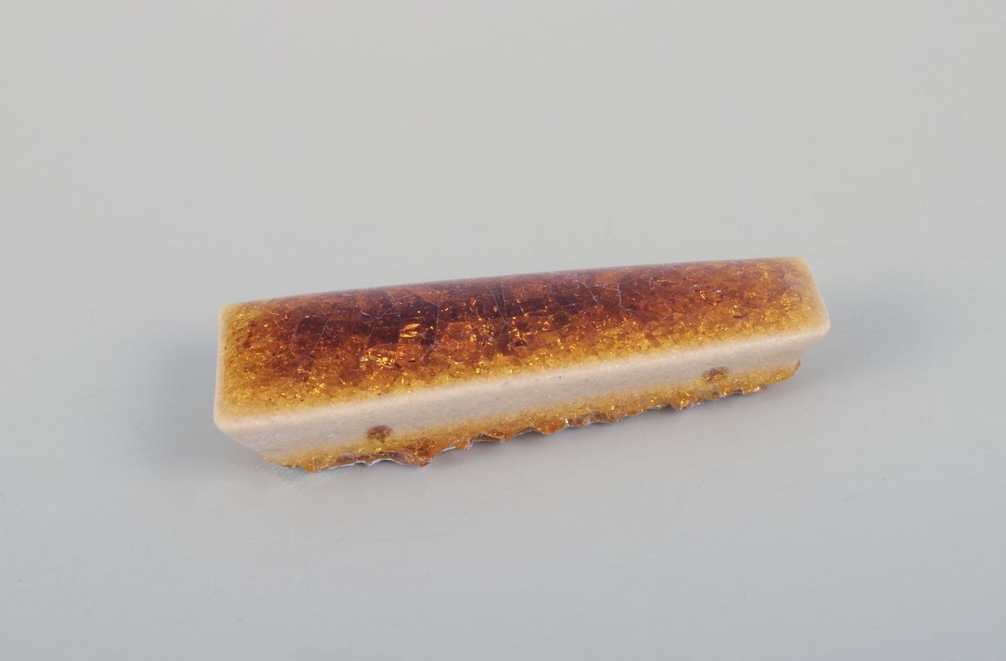 Ti unika brocher i glaseret stentøj i forskellige farver.
