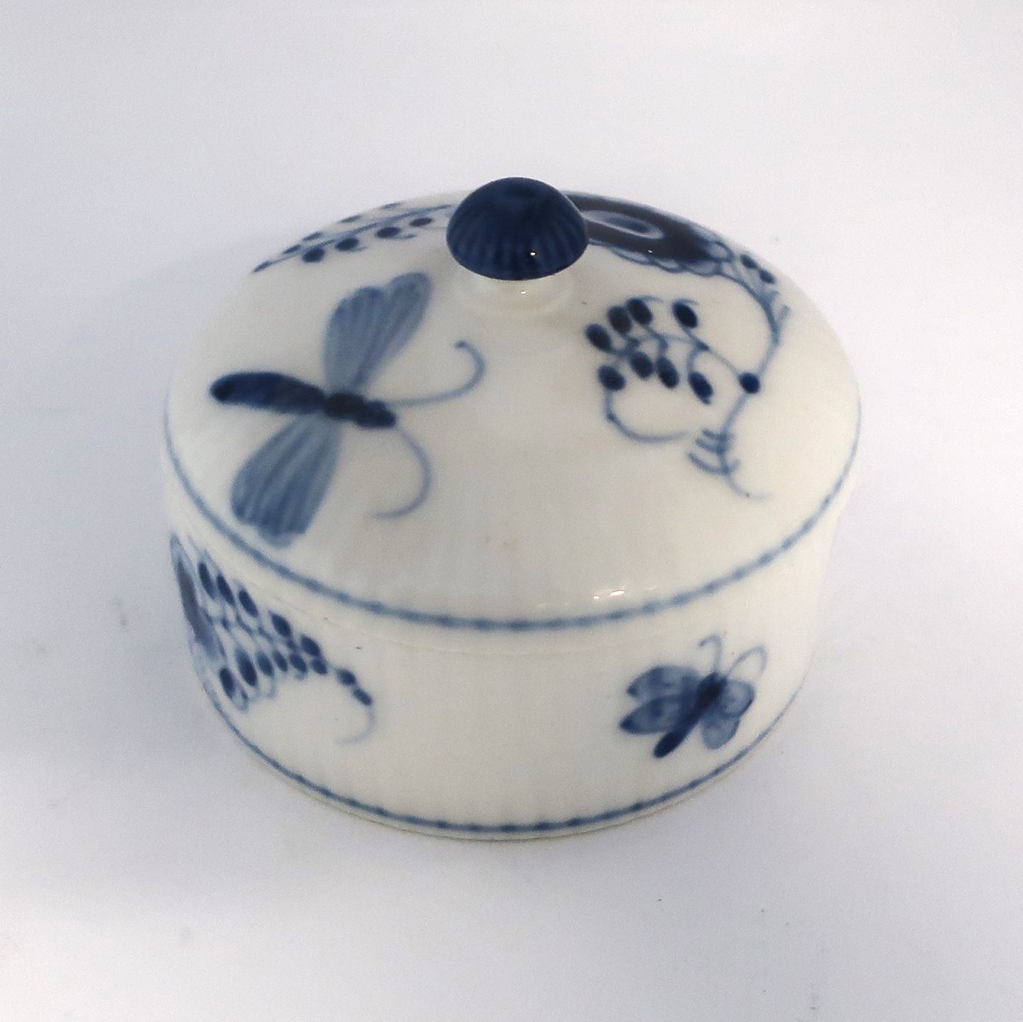 Royal Copenhagen. Musselmalet, riflet. Bonbonniere, dekoreret med insekter. Model 2115. Diameter 8 cm. Produceret før 1923. (1 sortering)