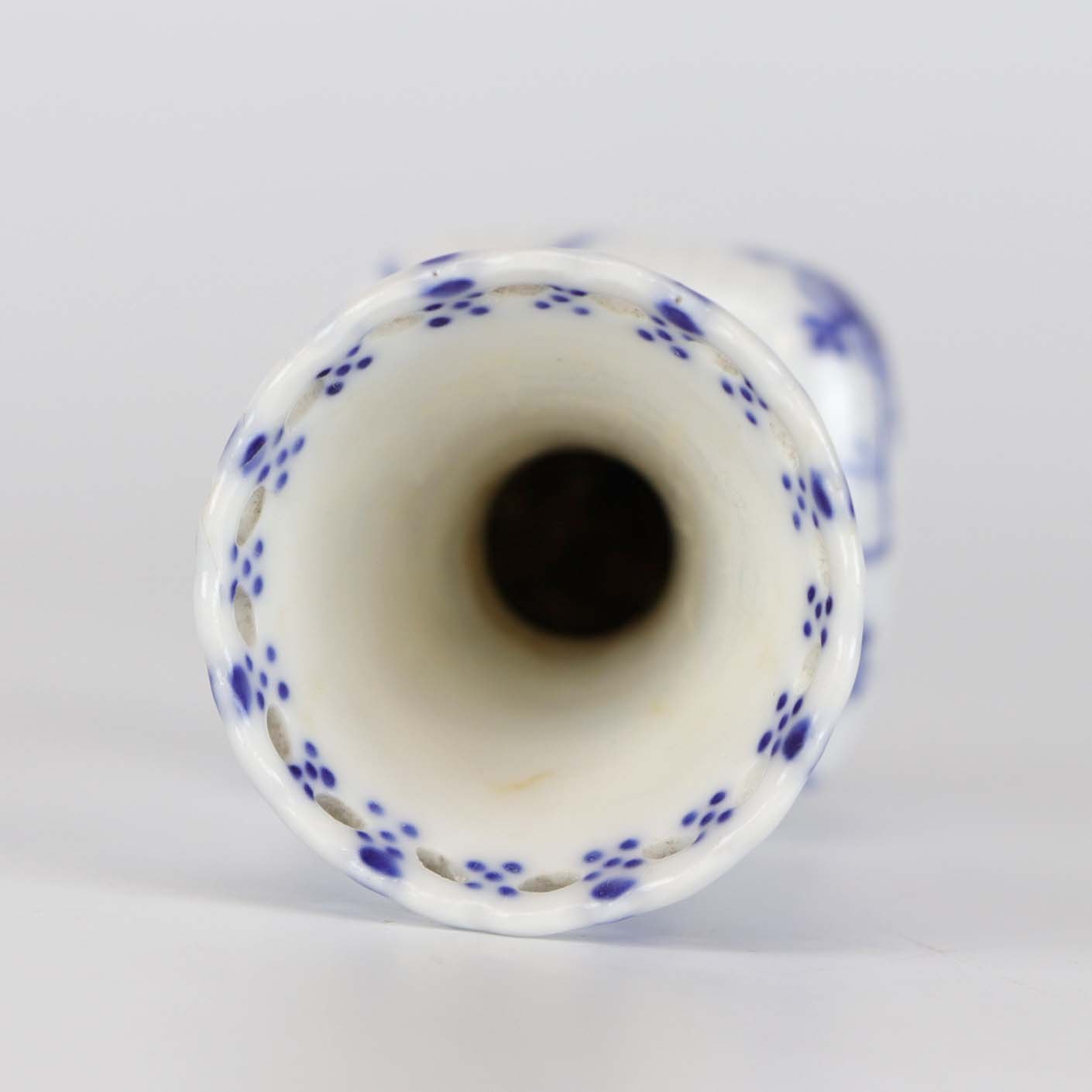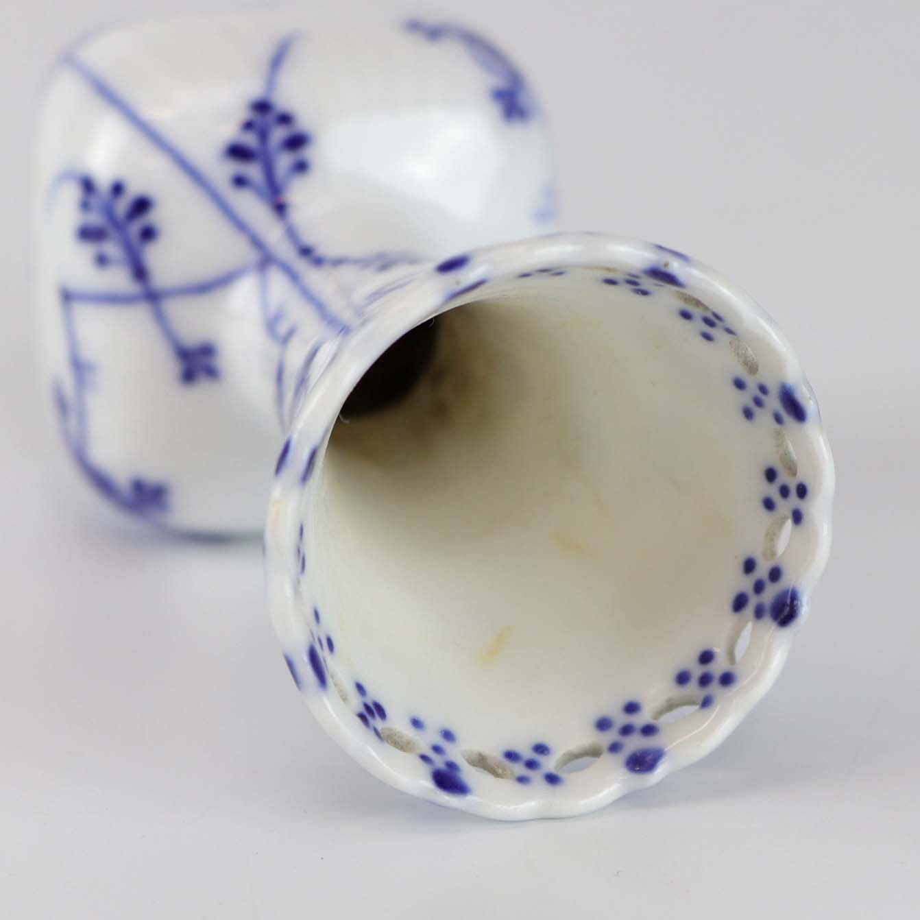 Stellet Musselmalet Helblonde er hvidt porcelæn dekoreret med blå blomster og mønstre. Øverst er porcelænet dekoreret med hulmønster.