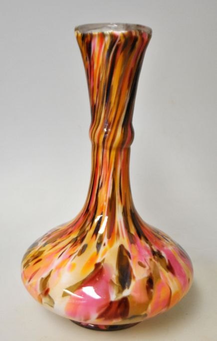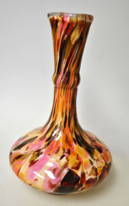 Art Nouveau vase, Germany, ca.1900. Multicolored glass with white overlay. Vaulted corpus on stand and bud on the stem. The edge is turned on the top. Spherically sanded. H.: 20.5 cm.
