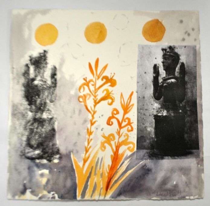 Degett, Karen (1954 - 2011) Denmark: Yellow lilies. Watercolor and print on paper. Signed: Karen Degett. On the back: "Yellow lilies from mother". 39.5 x 40 cm.