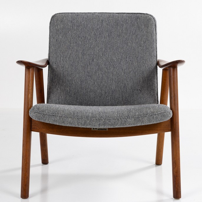 JH 517 - 'Bukkestol' i patineret teak og nyt tekstil fra Kjellerup Væveri (COLOR 10-109) med mærke fra producent.
