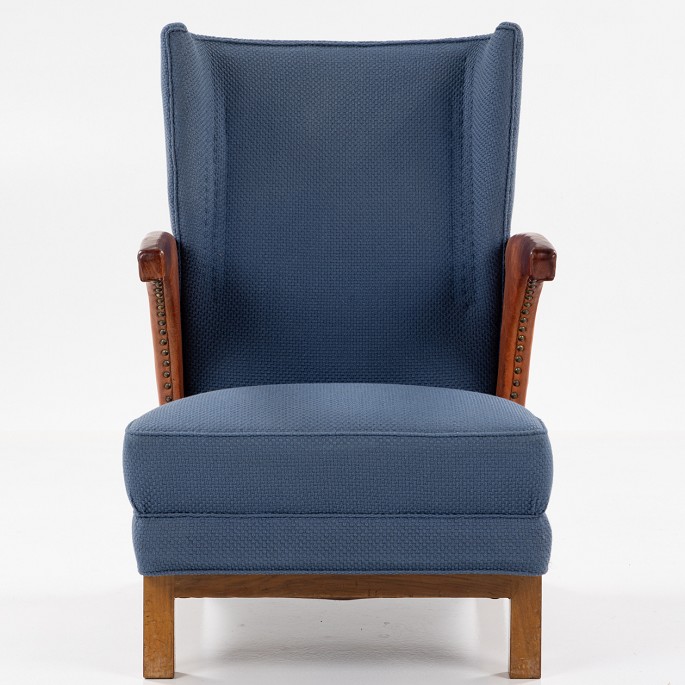Armchair in each patinated niger leather and blue textile with brass rivets and walnut frame.