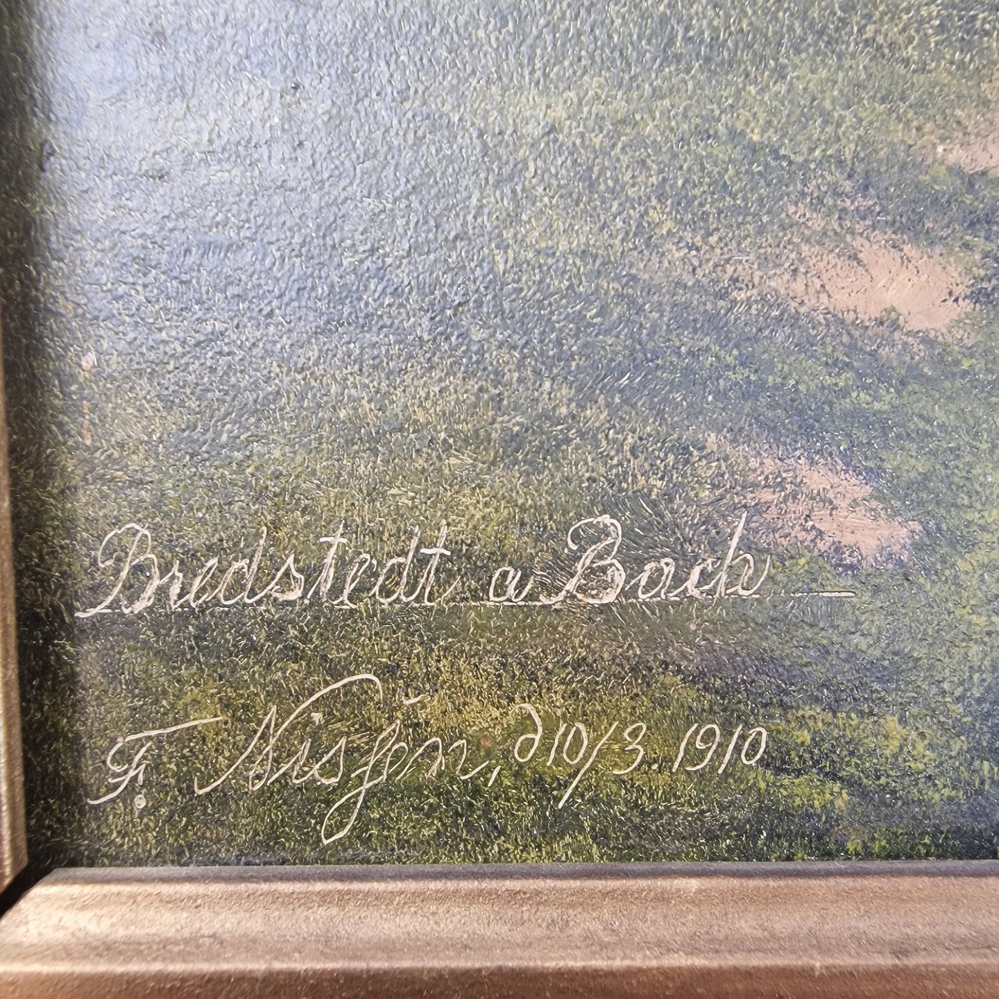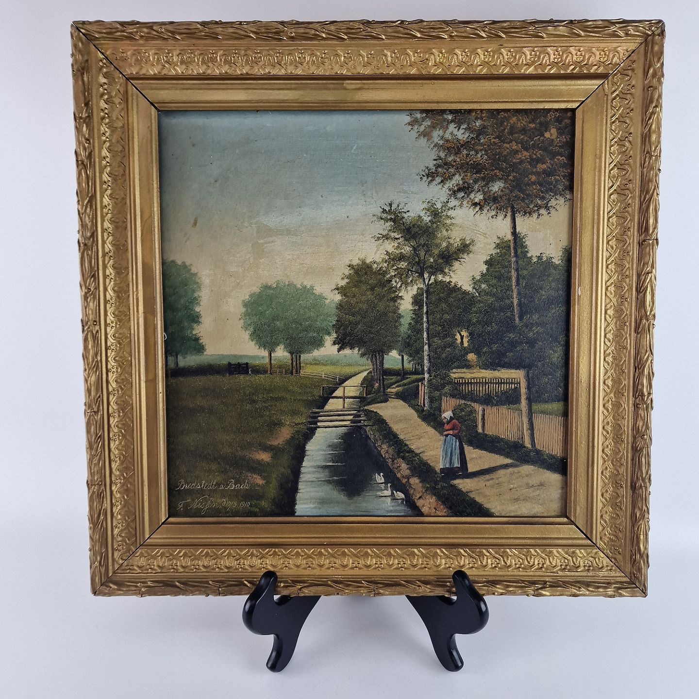 Maleri på plade med motiv af en kvinde ved en å. Dateret 10/3 1910 og med teksten Bredstedt a Bach