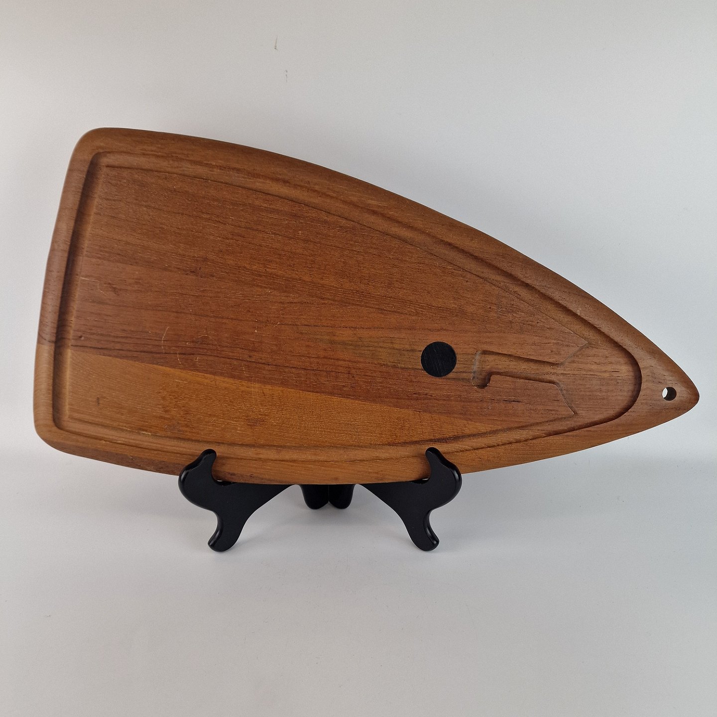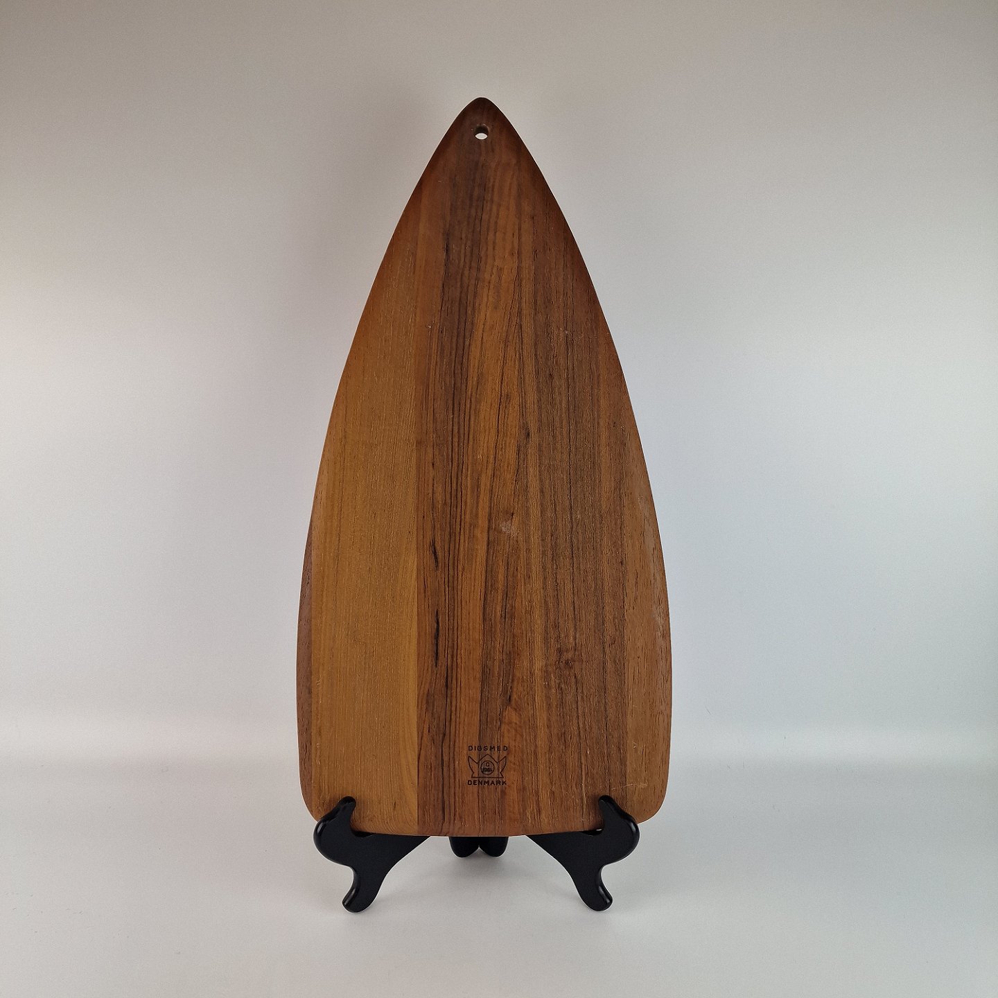 Skærebræt af teaktræ med kniv. I spidsen af brættet er en magnet, så kniven ikke falder af. Derudover er der saftrille og et lille hul til ophæng.