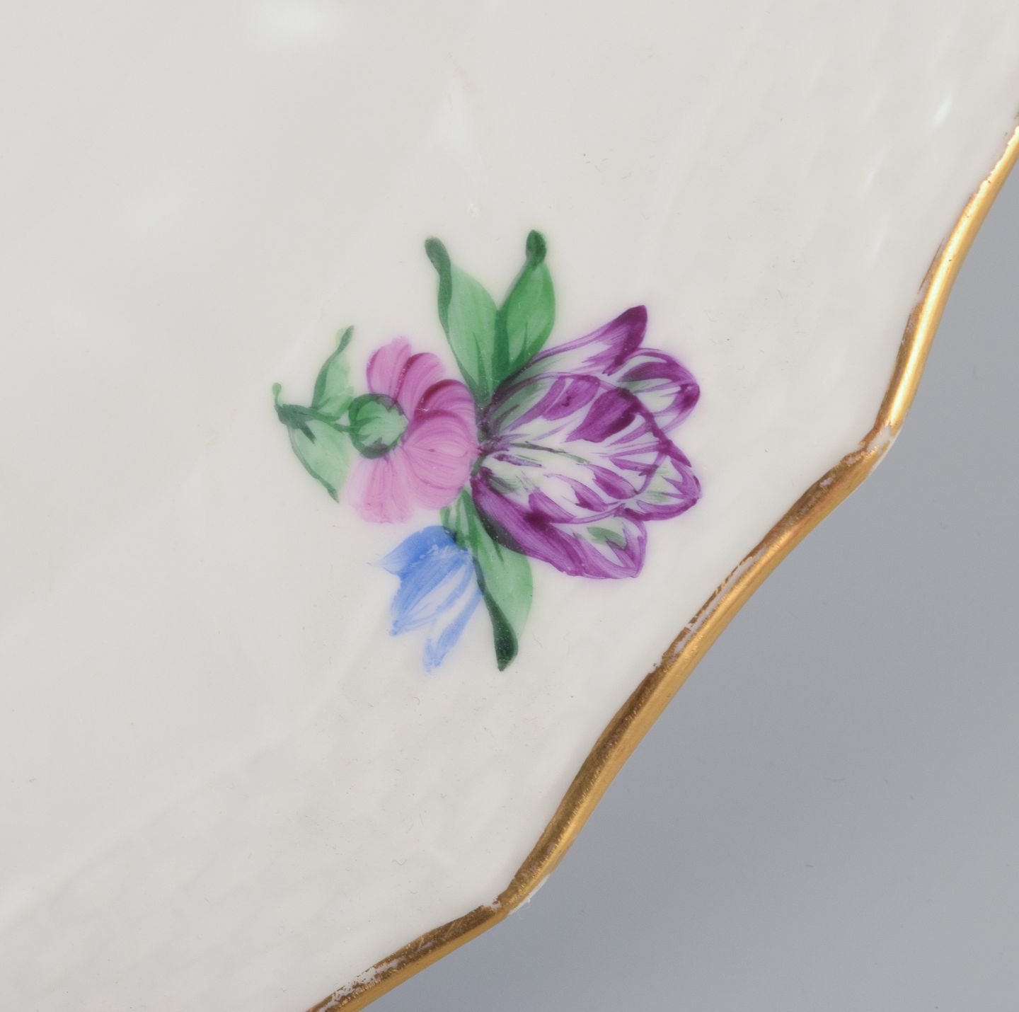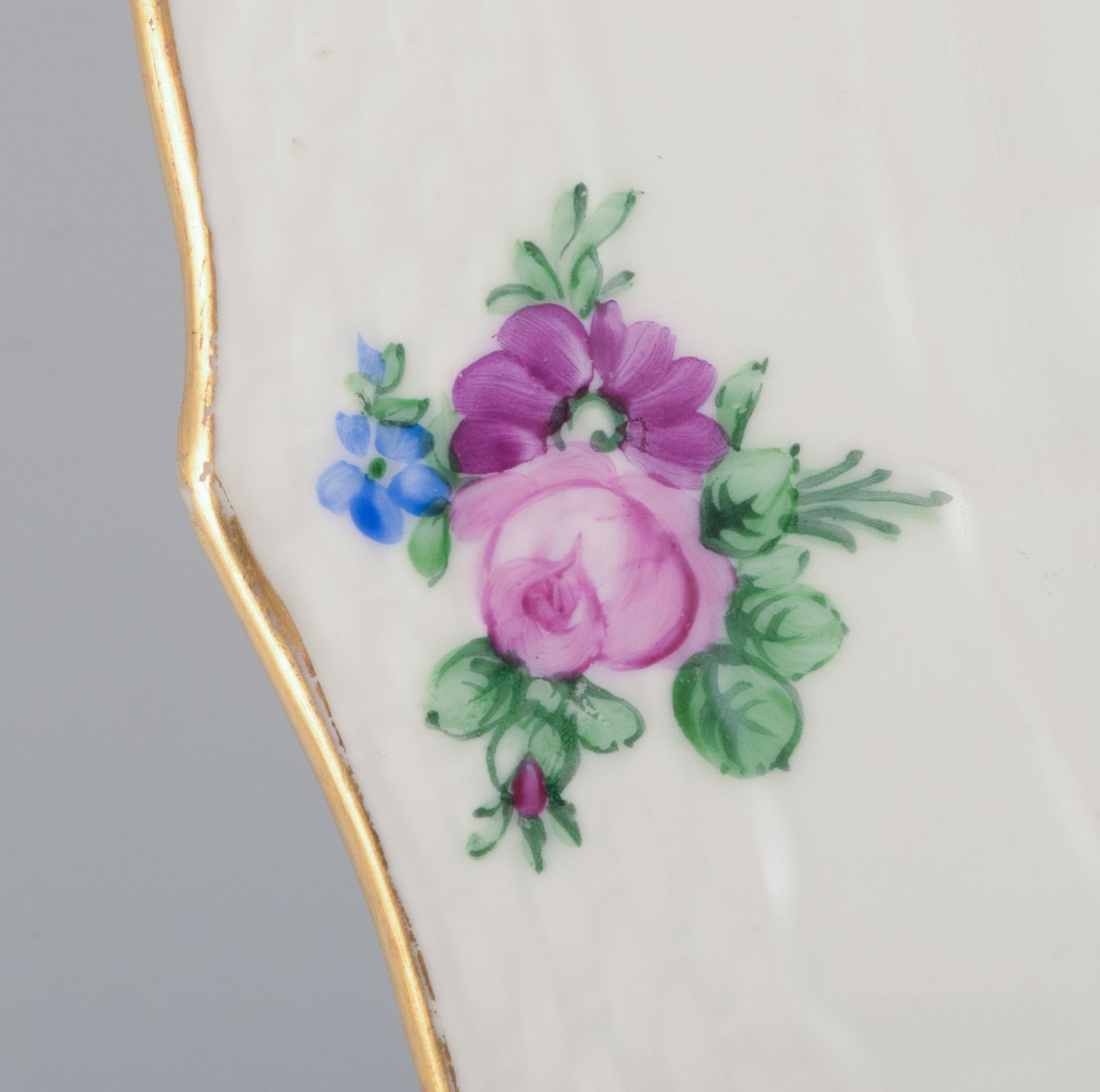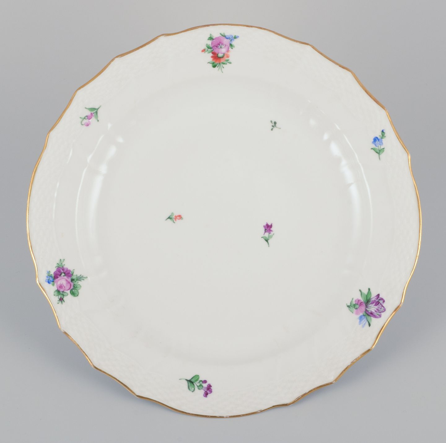 Royal Copenhagen Saksisk Blomst. Stort rundt serveringsfad i porcelæn. Håndmalet med polykrome blomster. Guldkant.