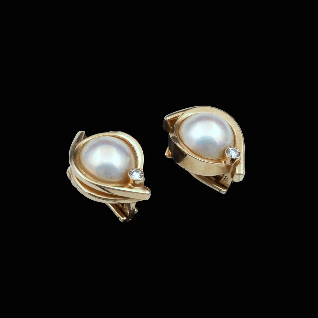 Per Borup Design. Øreklips i 14k guld med perler og brillanter.